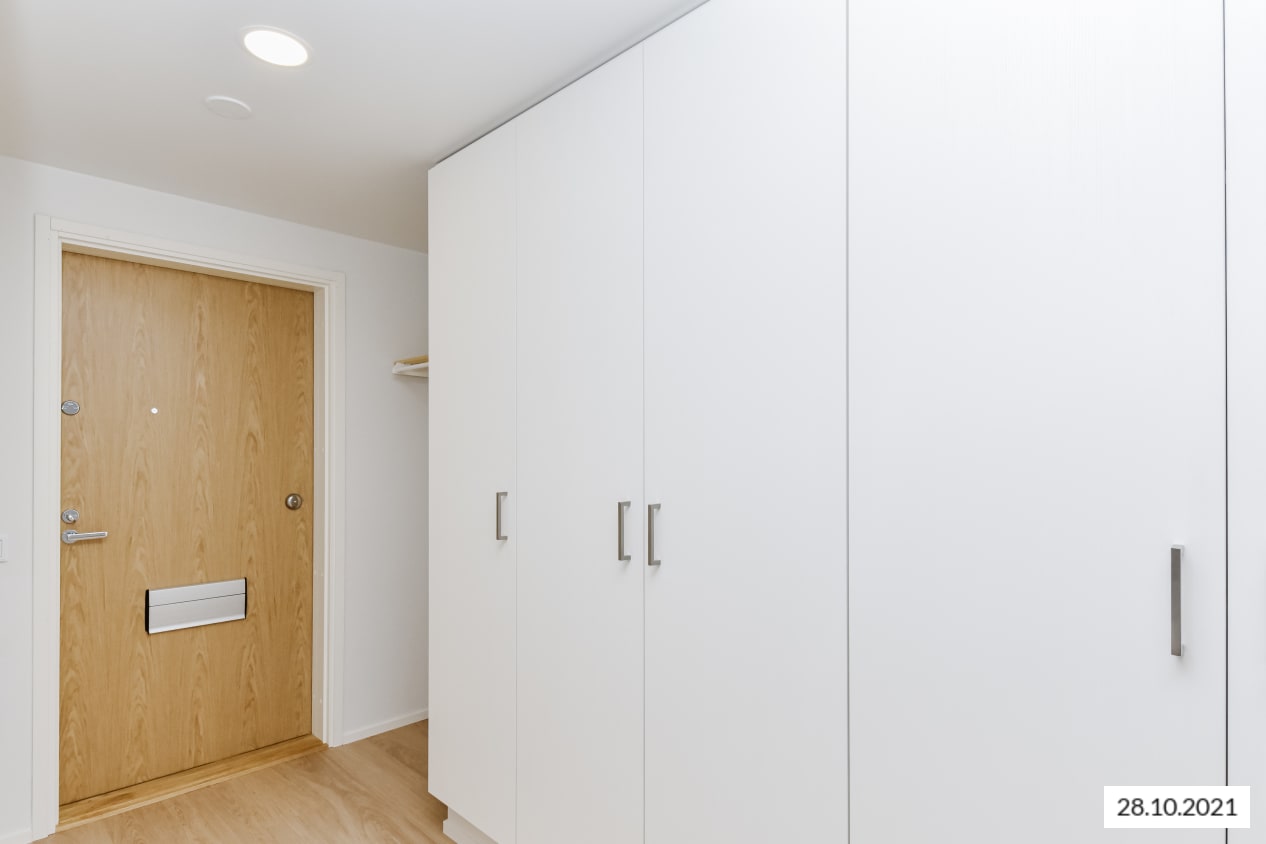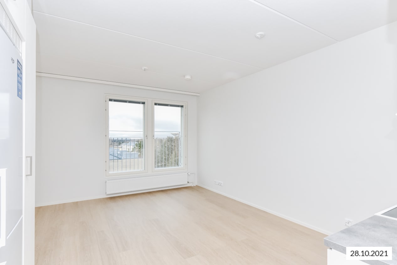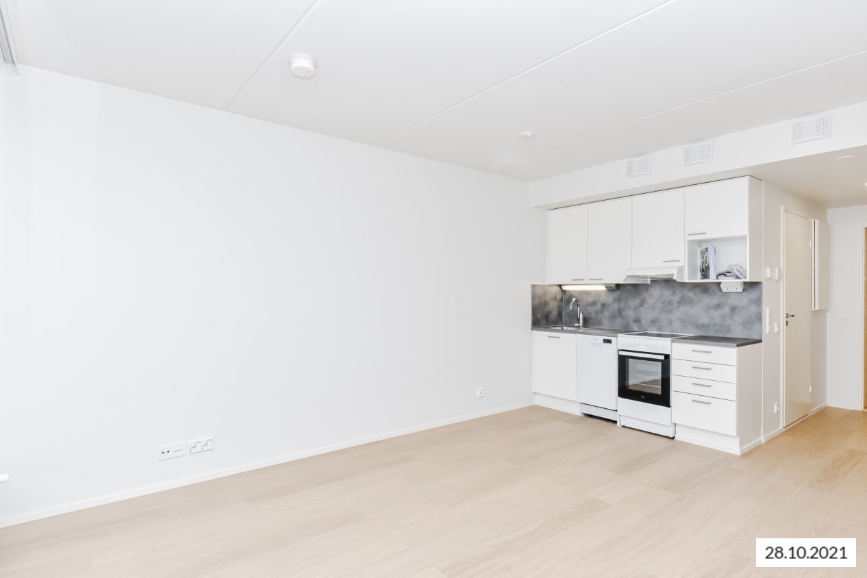 Completed in autumn 2021, this studio apartment is clean and timelessly beautiful. The kitchen and living room are combined into an open-plan living area, with large, opening windows for airiness and natural light. The home is finished in light-coloured finishes to suit all tastes. The flooring is light oak laminate and the walls are painted white. The open-plan kitchen has white, wood-panelled cabinets. The space between the upper and lower cupboards and the worktop are grey laminate. Fittings include a ceramic hob, cooker hood, fridge-freezer and dishwasher. The appliances are white. The bathroom is fitted with white SATO Kide furniture and space for a washing machine. The walls are white tiles and the floor is grey.