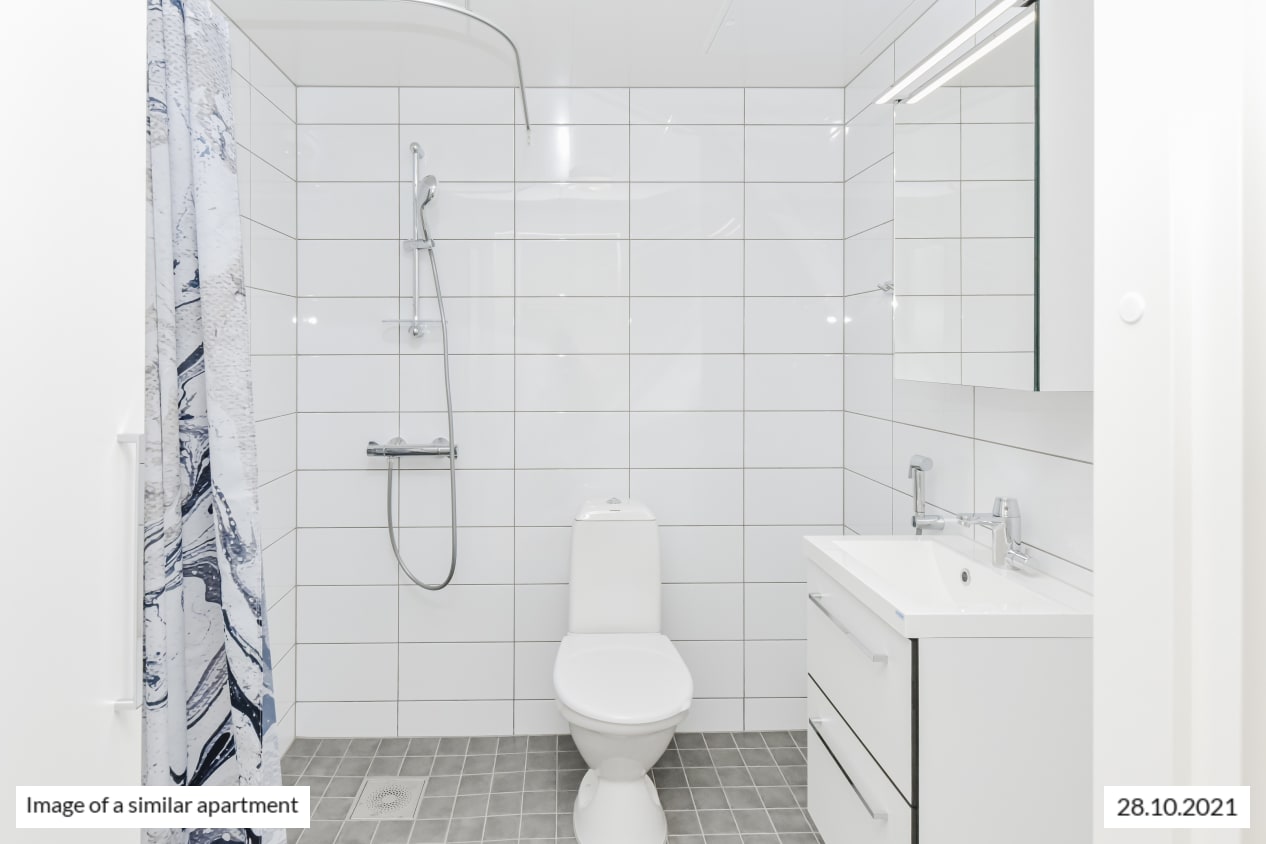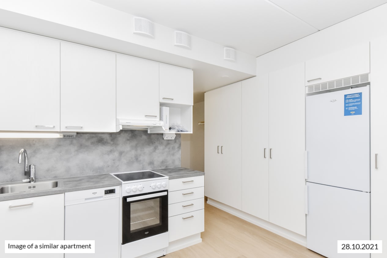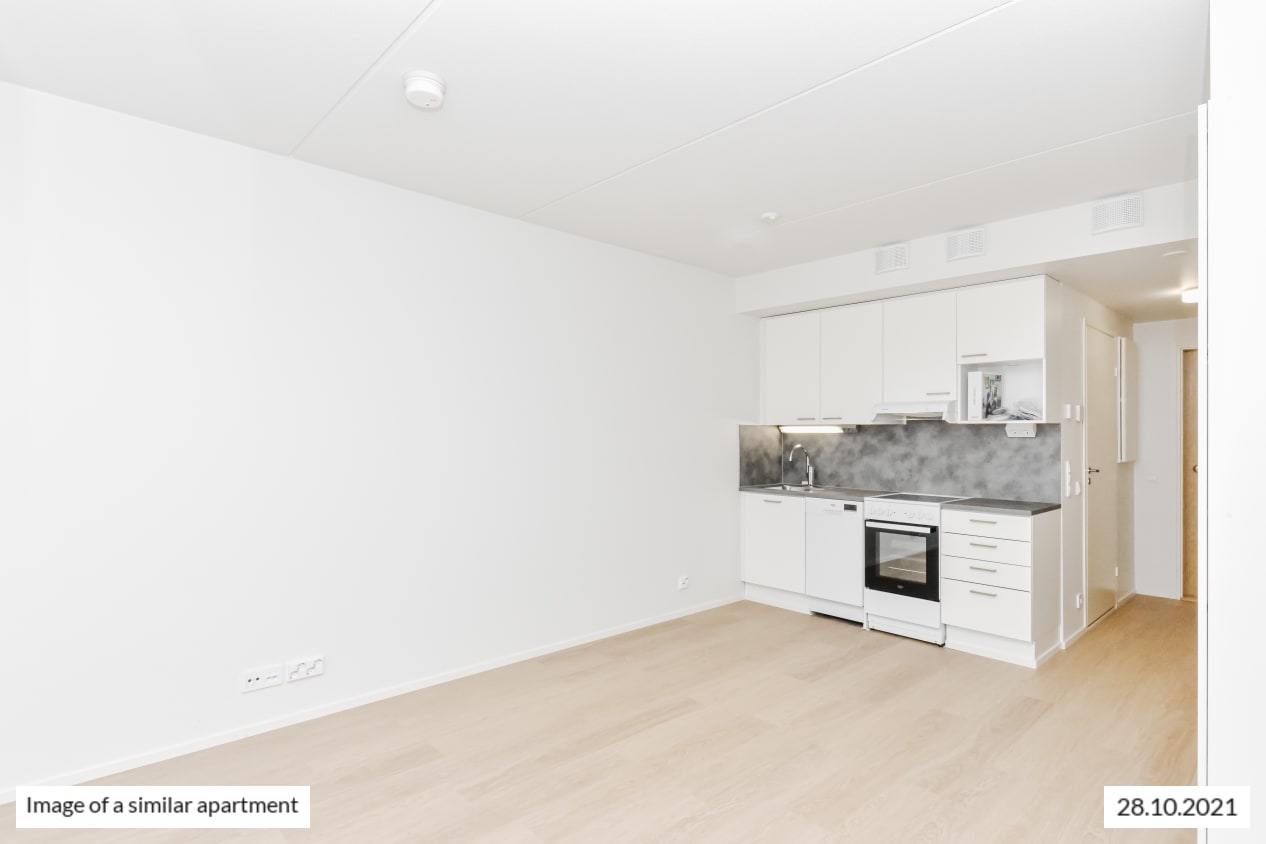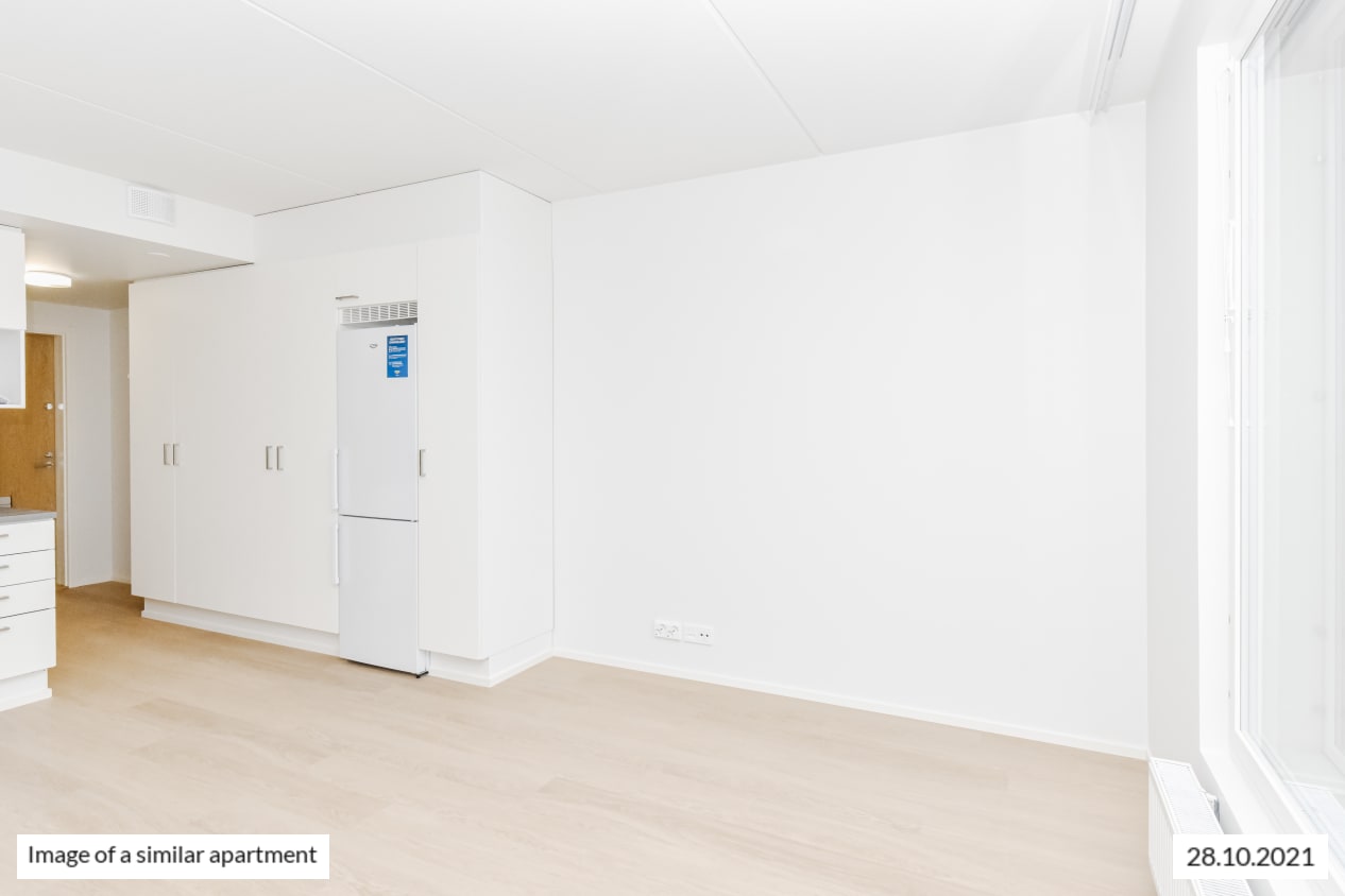 Completed in autumn 2021, this studio apartment is clean and timelessly beautiful. The kitchen and living room are combined into an open-plan living area, with large, opening windows for airiness and natural light. The home is finished in light-coloured finishes to suit all tastes. The flooring is light oak laminate and the walls are painted white. The open-plan kitchen has white, wood-panelled cabinets. The space between the upper and lower cupboards and the worktop are grey laminate.