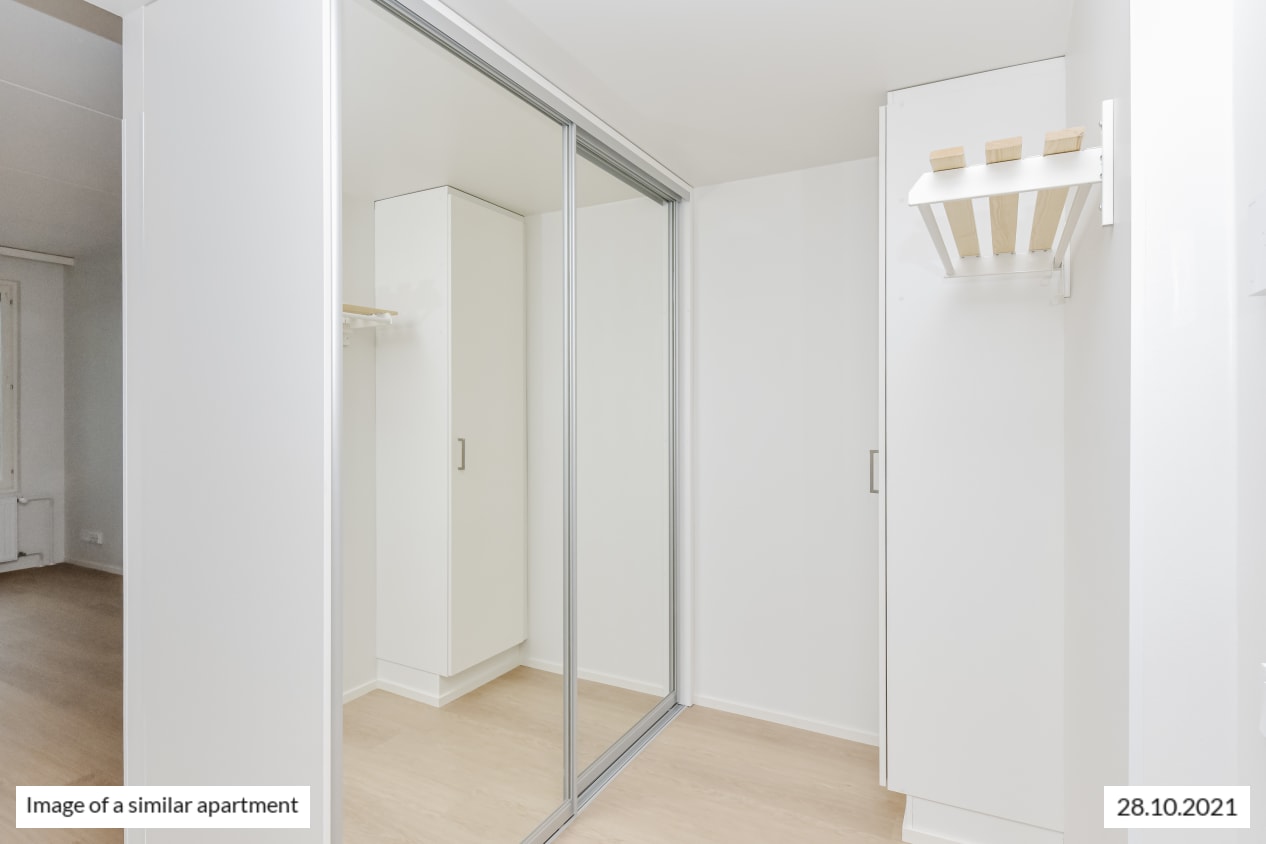 Completed in autumn 2021, the heart of the one-bedroom apartment is a spacious living room with access to a glazed balcony. The surfaces of the home are light and the overall look is modern. The flooring is oak laminate and the walls are painted white. The kitchen, which opens into the living room, has white, wood-panelled cabinets. The space between the upper and lower cupboards and the worktop are in grey laminate. The appliances include a ceramic hob, cooker hood, fridge-freezer and dishwasher. The appliances are white. The bathroom is fitted with white SATO Kide furniture and space for a washing machine. The walls are white tiles and the floor is grey. The hallway cupboard provides extra storage space.