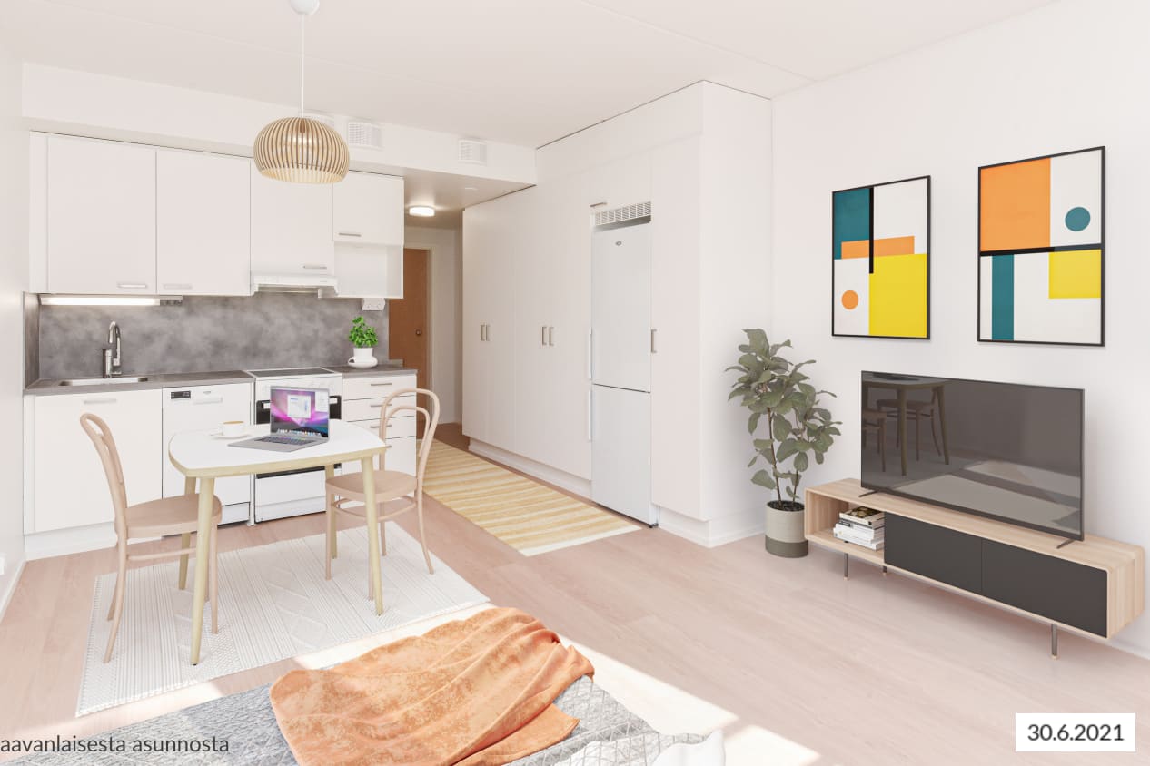 Completed in autumn 2021, this studio apartment is clean and timelessly beautiful. The kitchen and living room are combined into an open-plan living area, with large, opening windows for airiness and natural light. The home is finished in light-coloured finishes to suit all tastes. The flooring is light oak laminate and the walls are painted white. The open-plan kitchen has white, wood-panelled cabinets. The space between the upper and lower cupboards and the worktop are grey laminate. Fittings include a ceramic hob, cooker hood, fridge-freezer and dishwasher. The appliances are white. The bathroom is fitted with white SATO Kide furniture and space for a washing machine. The walls are white tiles and the floor is grey.