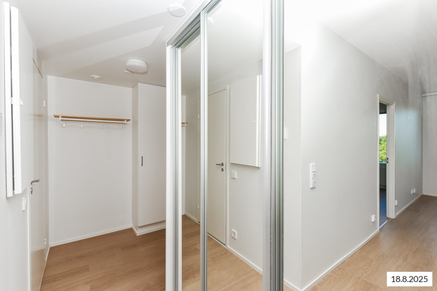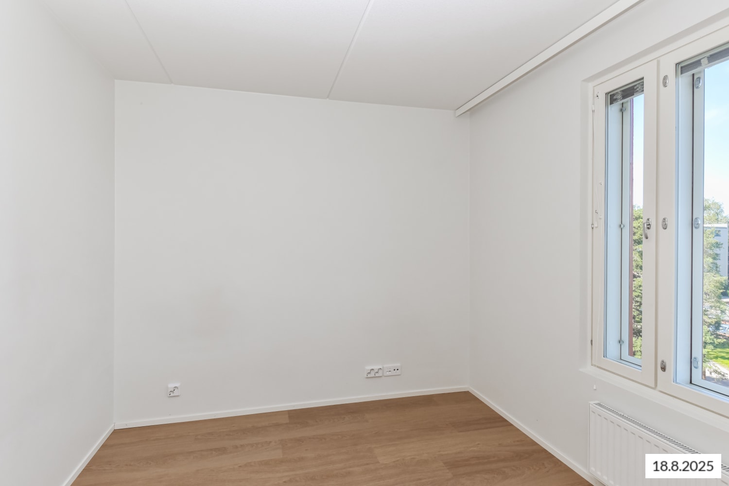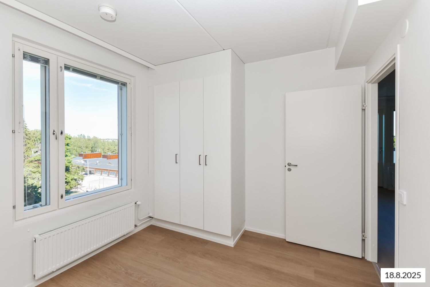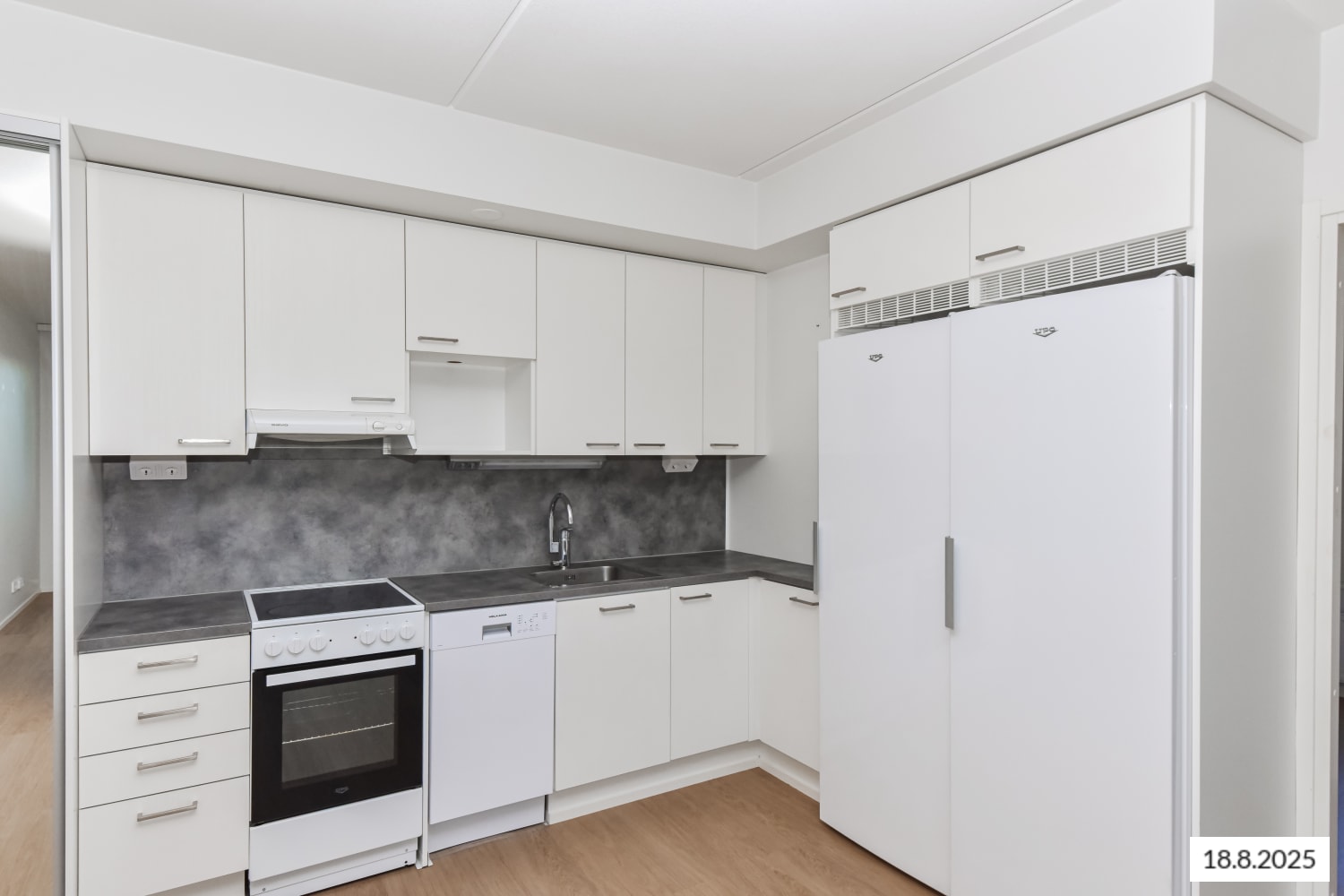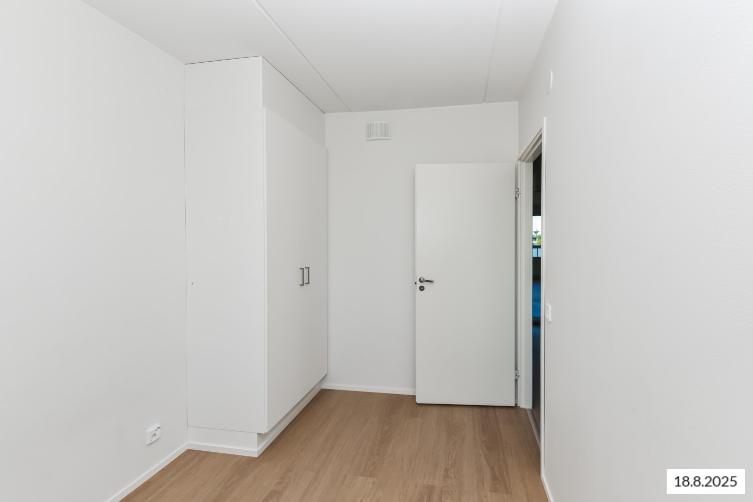 Completed in autumn 2021, the kitchen and living room form a functional and modern living area that you can easily decorate to your liking. The windows open in two directions and the glazed balcony is on the Uomapolku side. The smallest bedroom is separate from the other spaces and can easily double as a study. The surfaces of the home are light, with oak laminate flooring and white painted walls. The kitchen is fitted with white, wood-panelled cupboards. The space between the upper and lower cupboards and the worktop are grey laminate. Fittings include a ceramic hob, cooker hood, fridge, freezer and dishwasher. The appliances are white. The bathroom is fitted with white SATO Kide furniture and space for a washing machine. The walls are white tiles and the floor is grey.