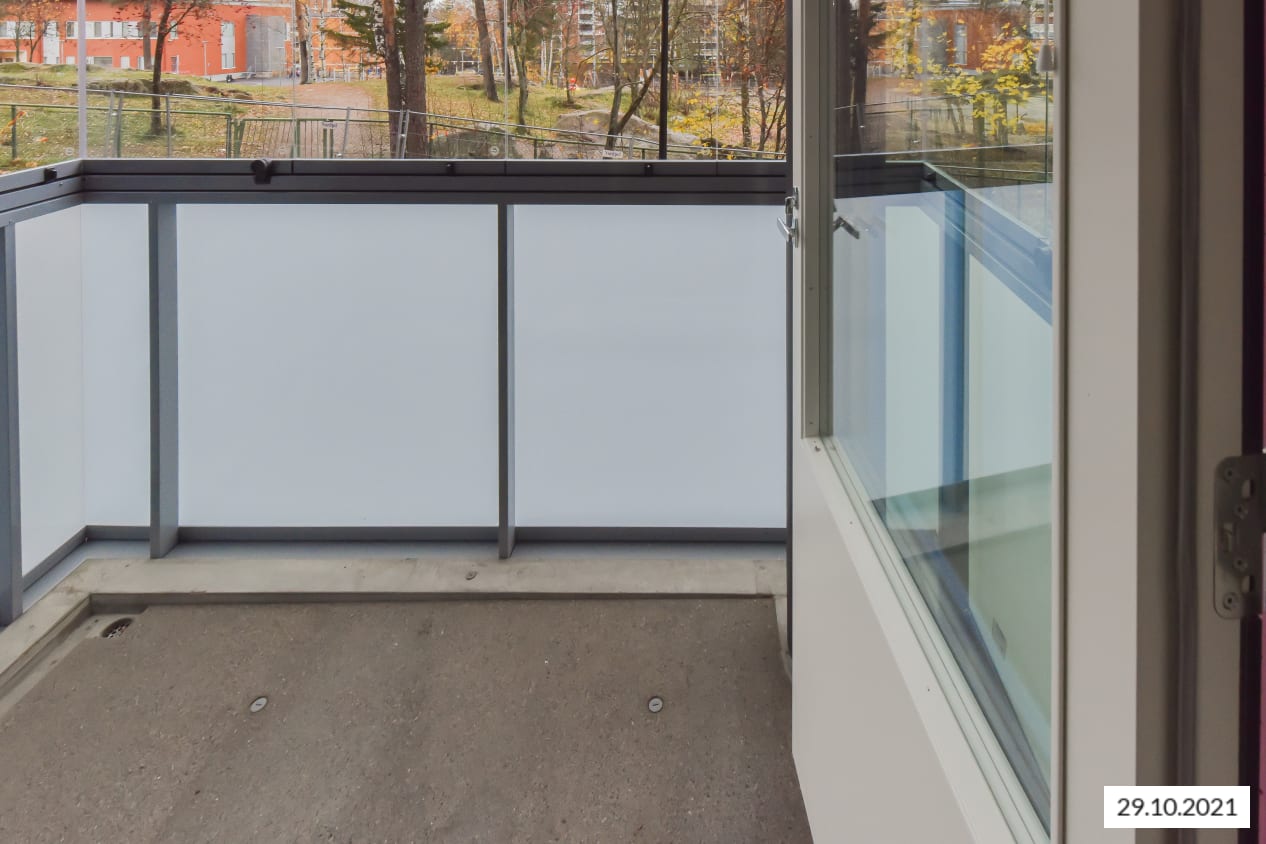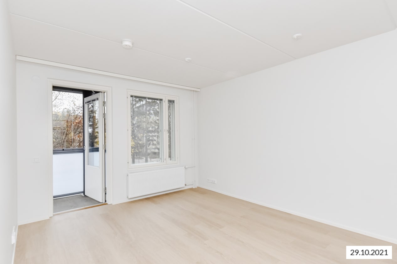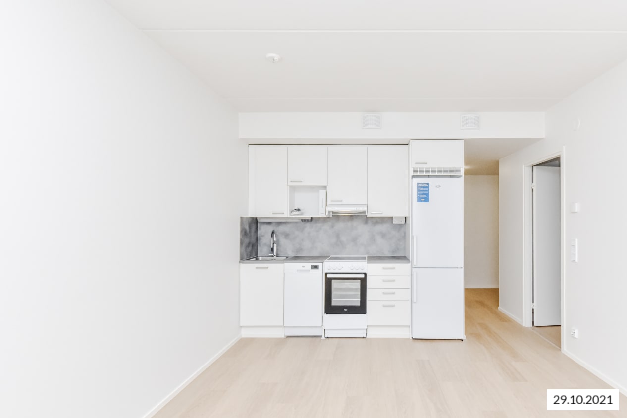 Completed in autumn 2021, the kitchen and living room of this clean and one-bedroom create a functional and modern home that you can easily decorate to your liking. The rooms have light-coloured surfaces, with oak laminate flooring and white painted walls. The kitchen has white, wood-panelled cabinets. The space between the upper and lower cabinets and the worktop are grey laminate. Fittings include a ceramic hob, cooker hood, fridge-freezer and dishwasher. The appliances are white. The bathroom is fitted with white SATO Kide furniture and space for a washing machine. The walls are white tiles and the floor is grey. The glazed balcony has a lush view towards Uomakuja.