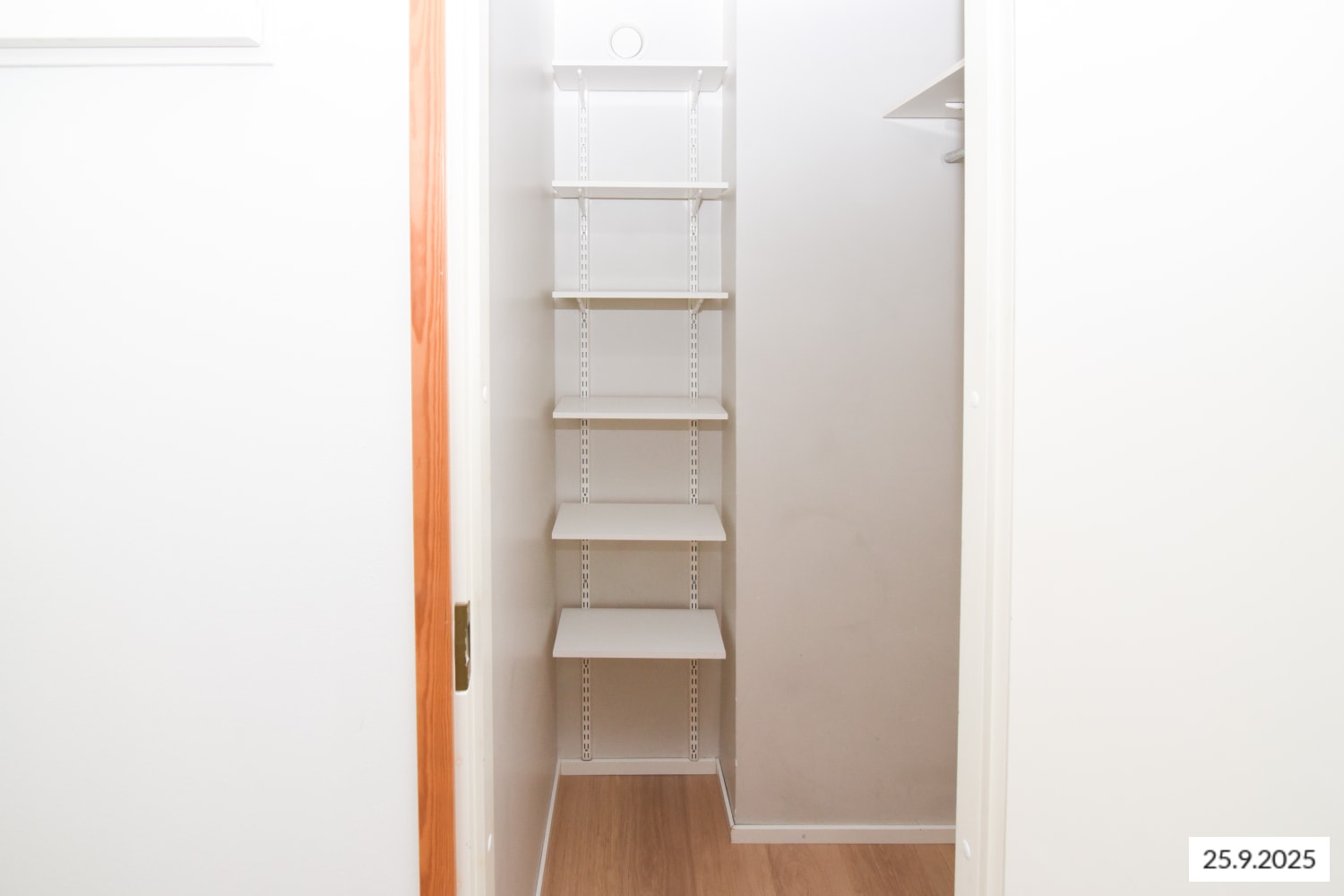 The bathroom has space reserved for your washing machine. The home is crowned by its own sauna, where you can relax whenever it suits you best. Storage space is available in the bedroom's walk-in wardrobe.