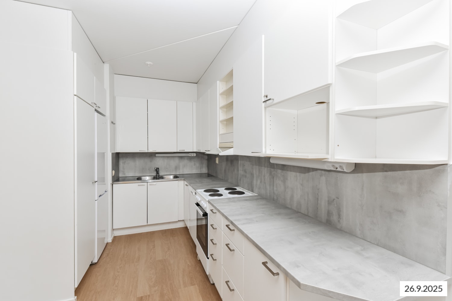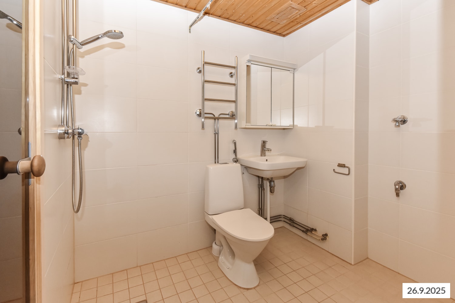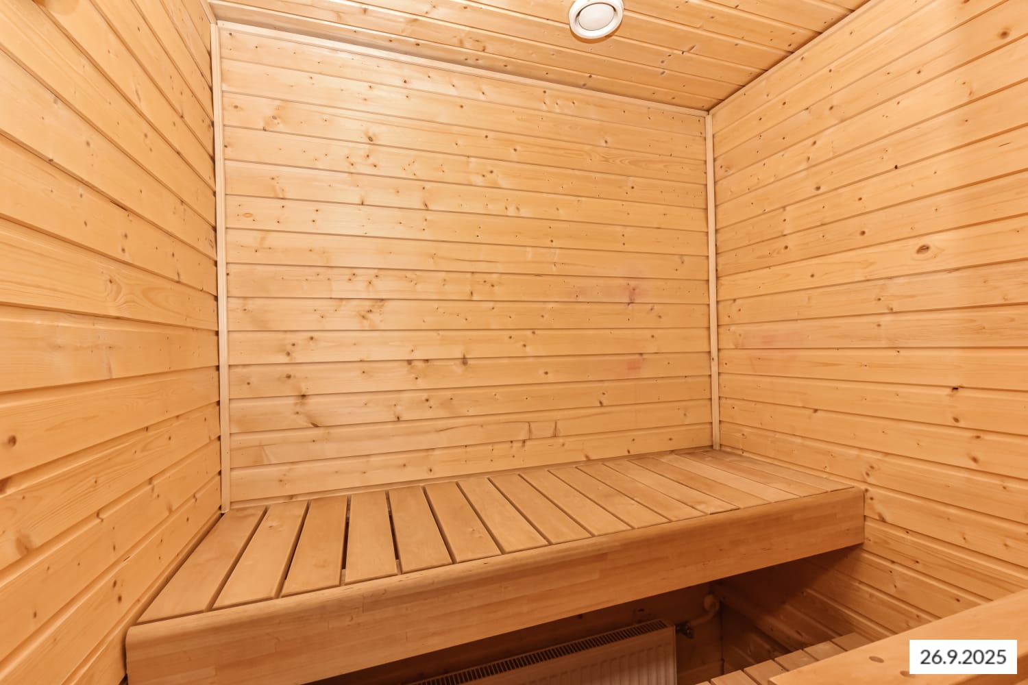 The kitchen is equipped with a dishwasher, and there's plenty of space for a dining table. The bathroom has connections for a washer-dryer. You can relax in the warmth of your own sauna whenever it suits you best.