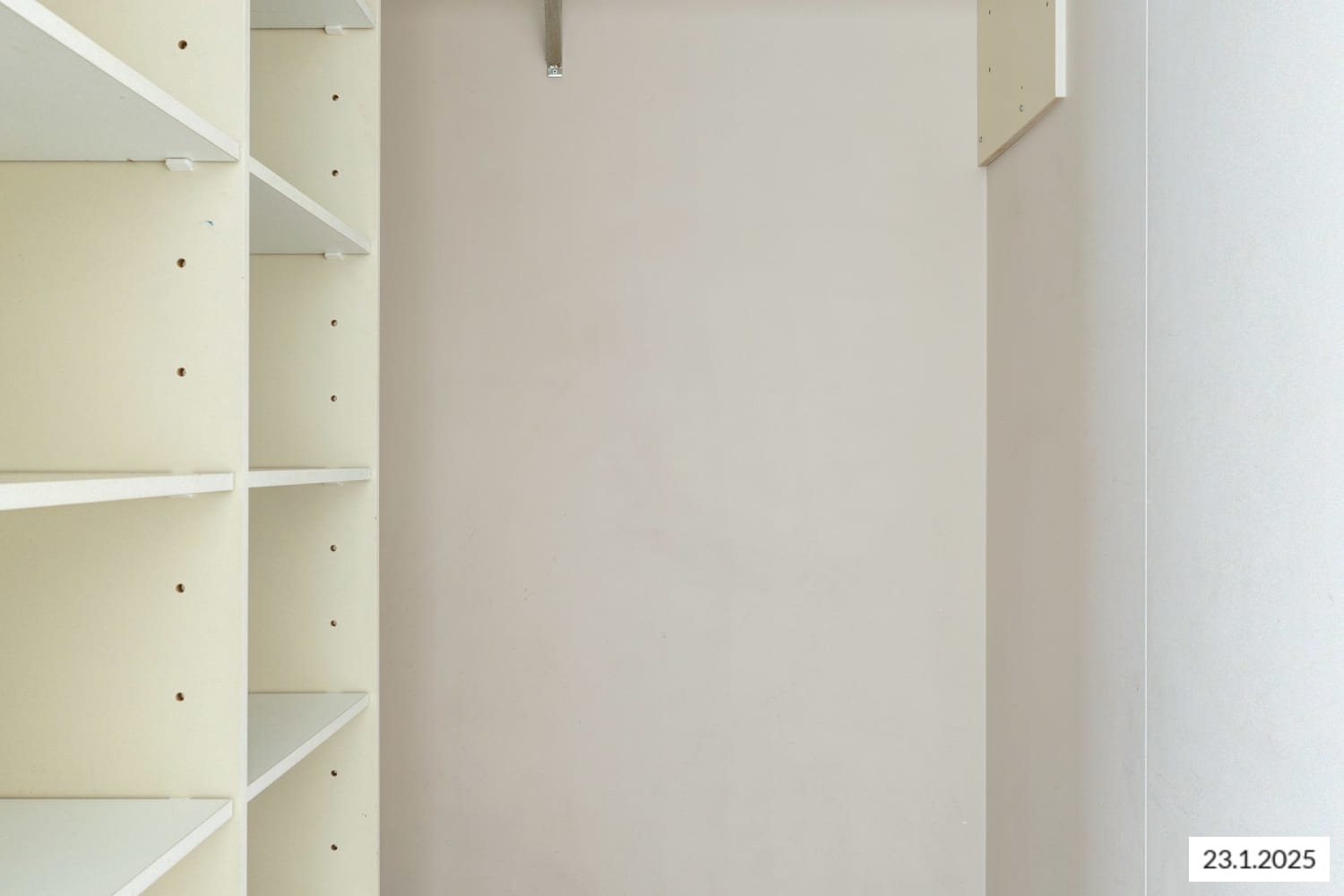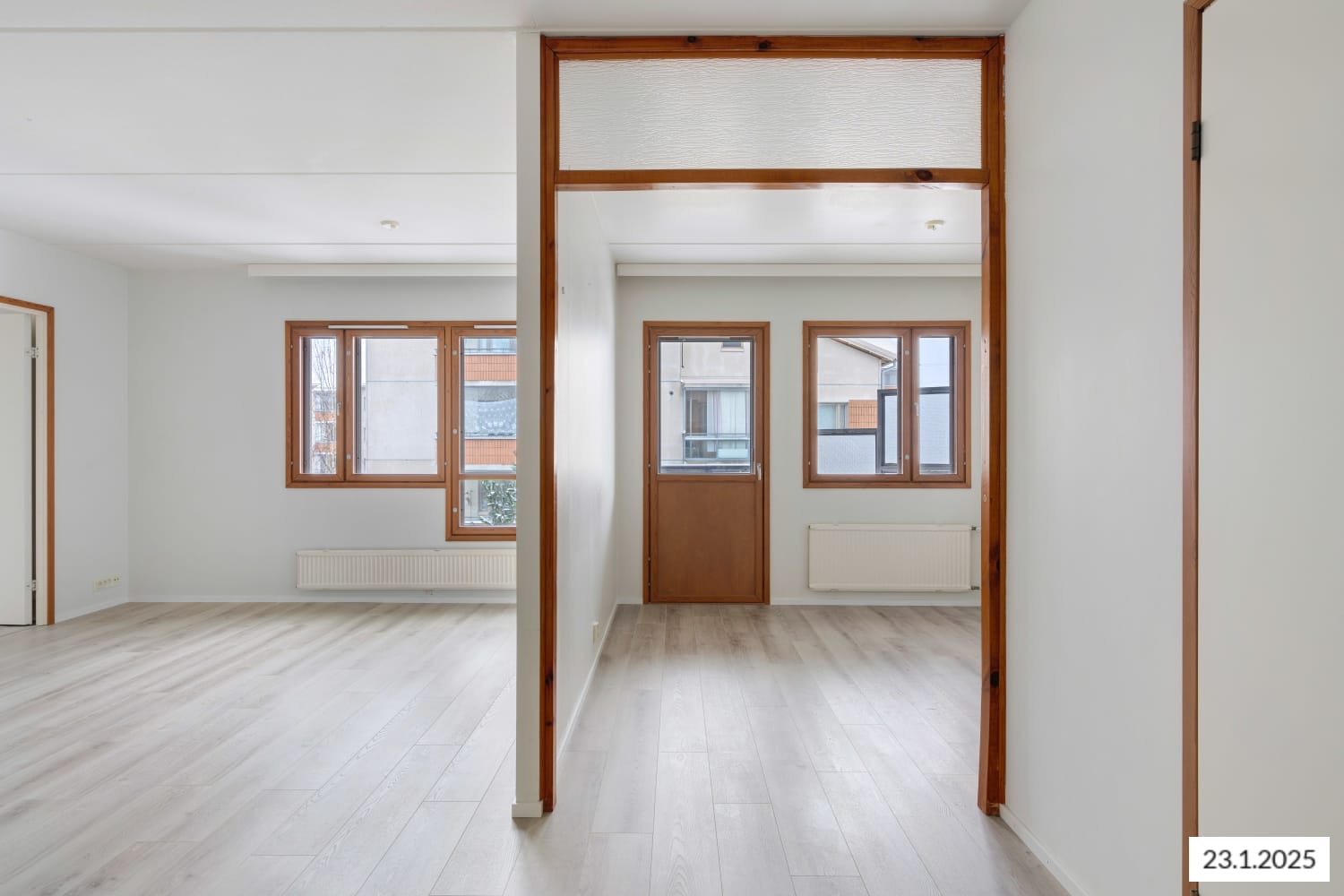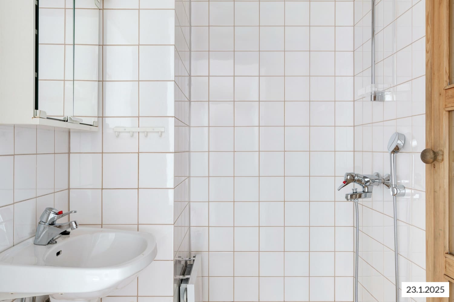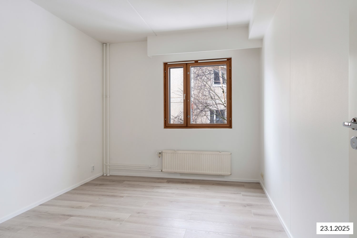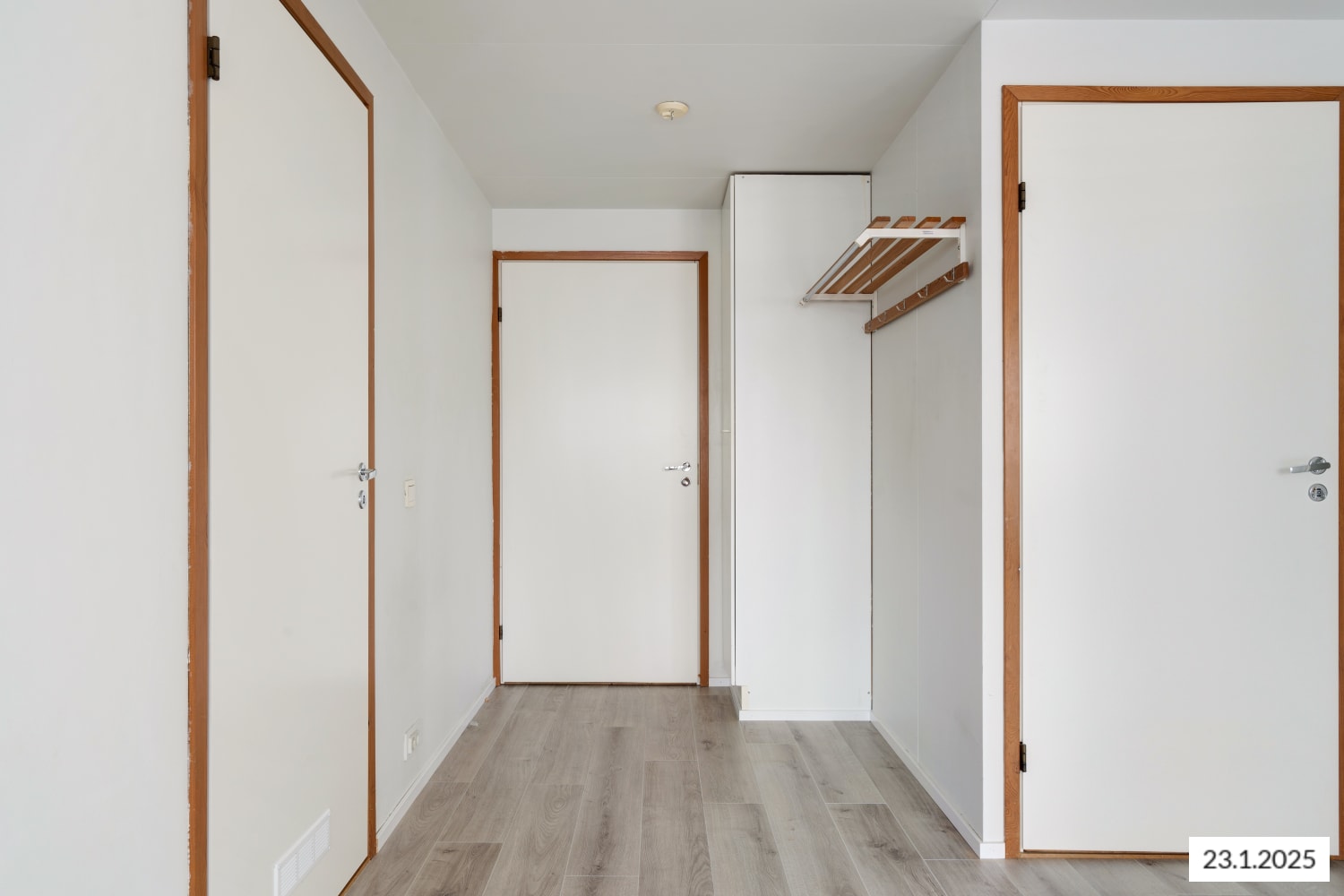 The courtyard formed by three apartment buildings is lush and private. This three-bedroom home has a traditional and easy-to-furnish layout, featuring two equally sized bedrooms and a separate kitchen with space for a dining table. In addition to the bathroom, there is a separate WC for added convenience. A walk-in wardrobe provides ample storage for clothes and other items.