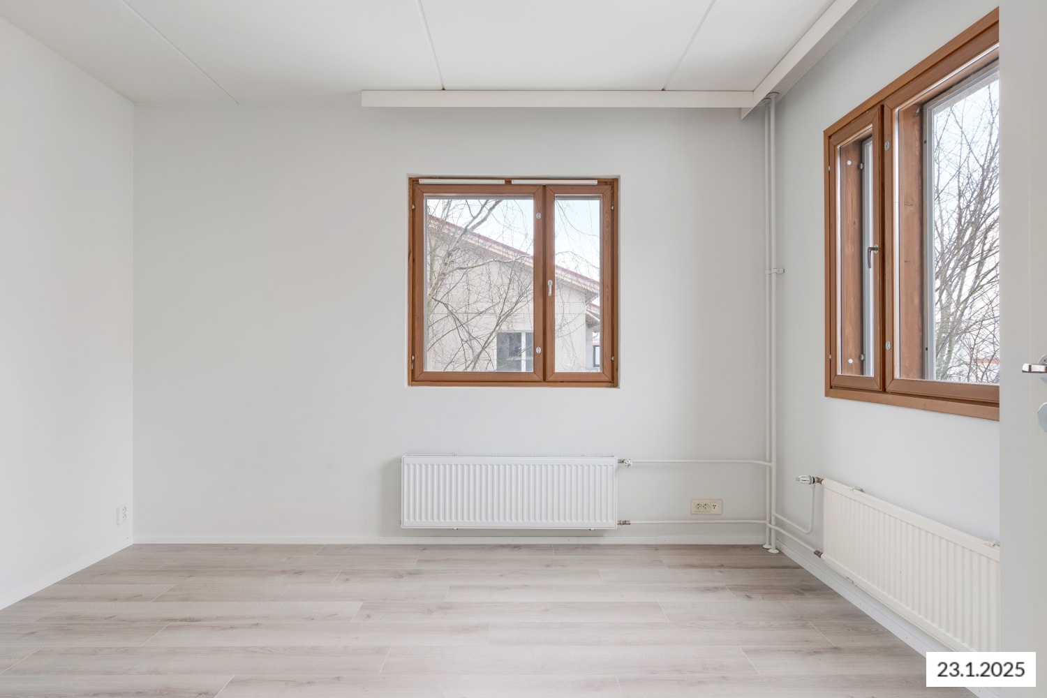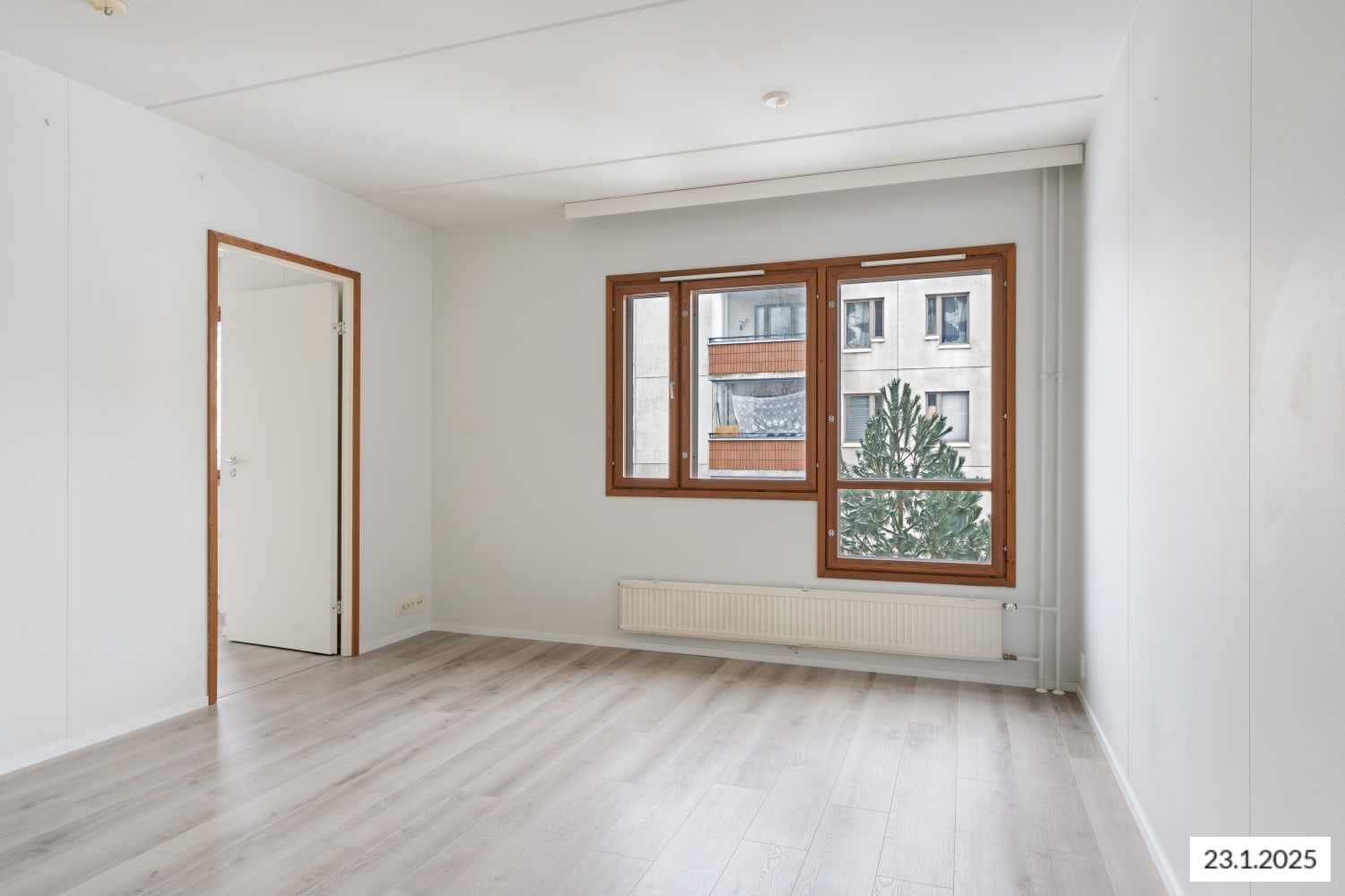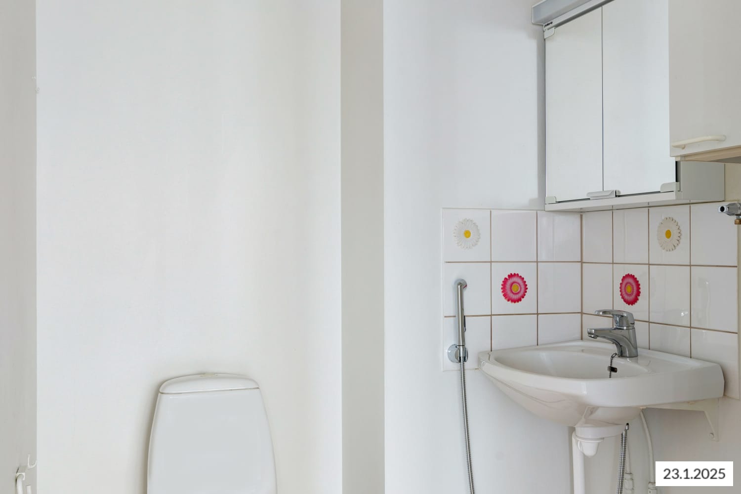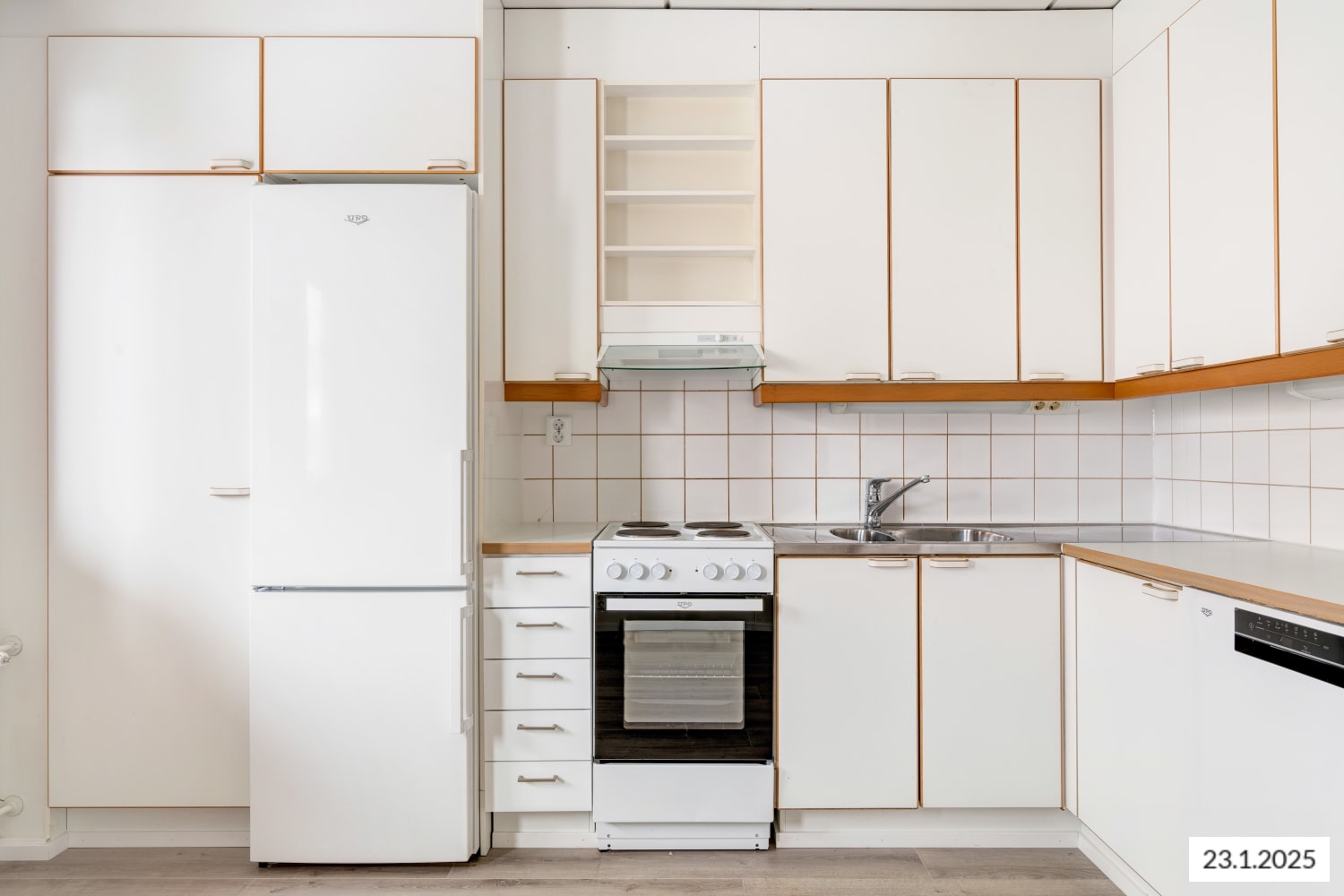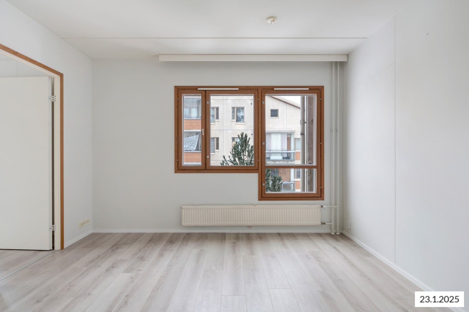 The courtyard formed by three apartment buildings is lush and private. This three-bedroom home has a traditional and easy-to-furnish layout, featuring two equally sized bedrooms and a separate kitchen with space for a dining table. In addition to the bathroom, there is a separate WC for added convenience. A walk-in wardrobe provides ample storage for clothes and other items.