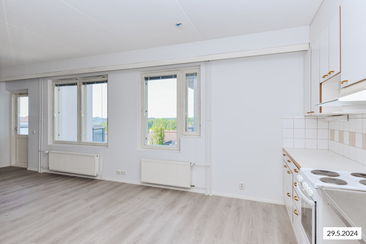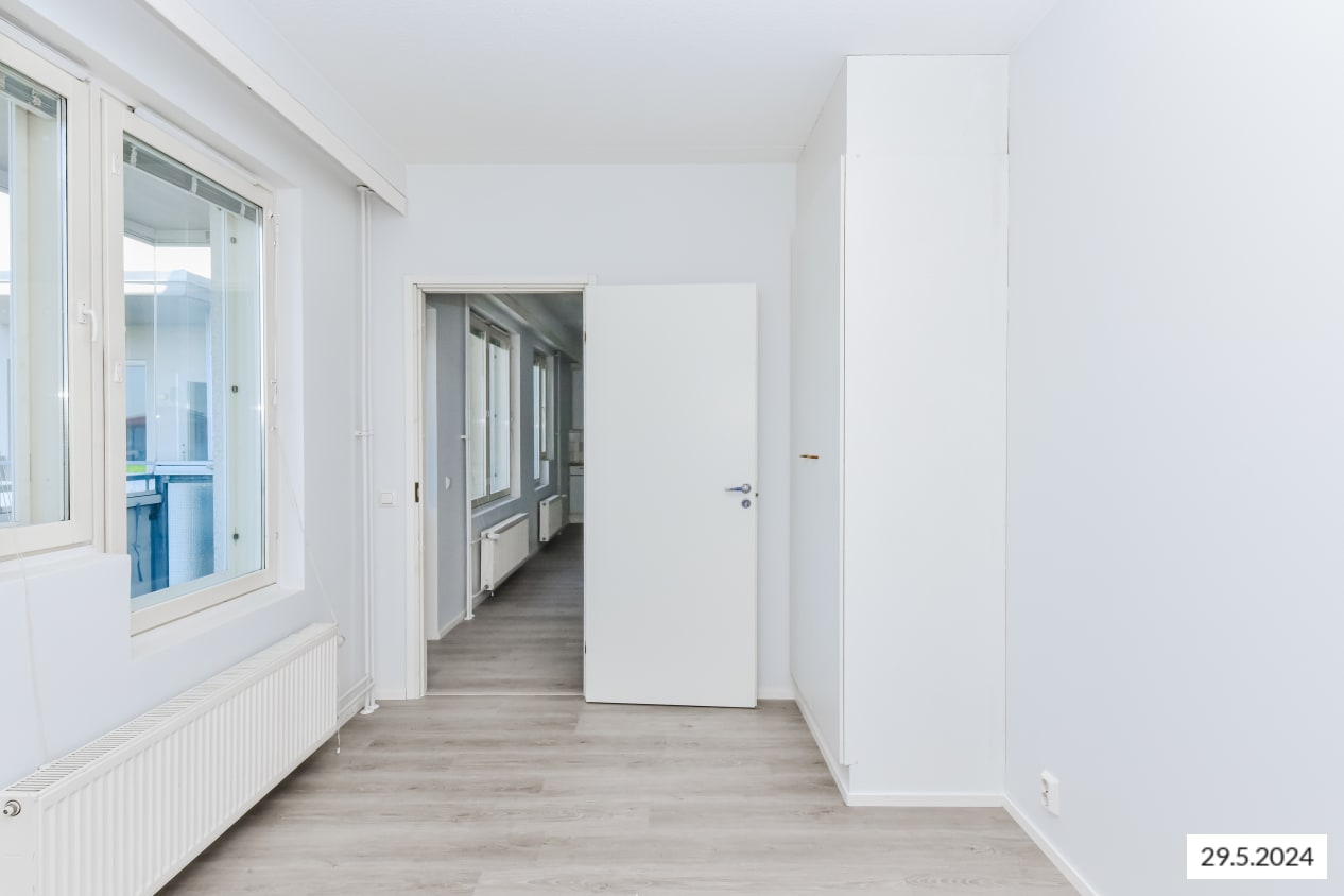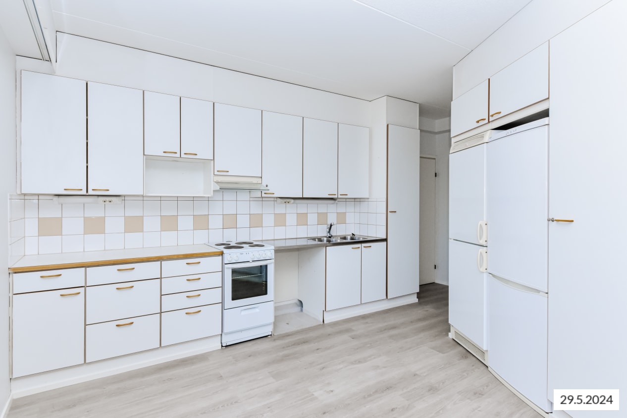 This bright and clean home has plenty of space to live in! It is well-suited for a family or as a shared apartment. The heart of the home is the spacious living room, which connects to the open kitchen. The kitchen offers ample cabinet space and cooking surfaces. It is equipped with a floor oven, stove, and refrigerator-freezer. A dishwasher can also be installed.