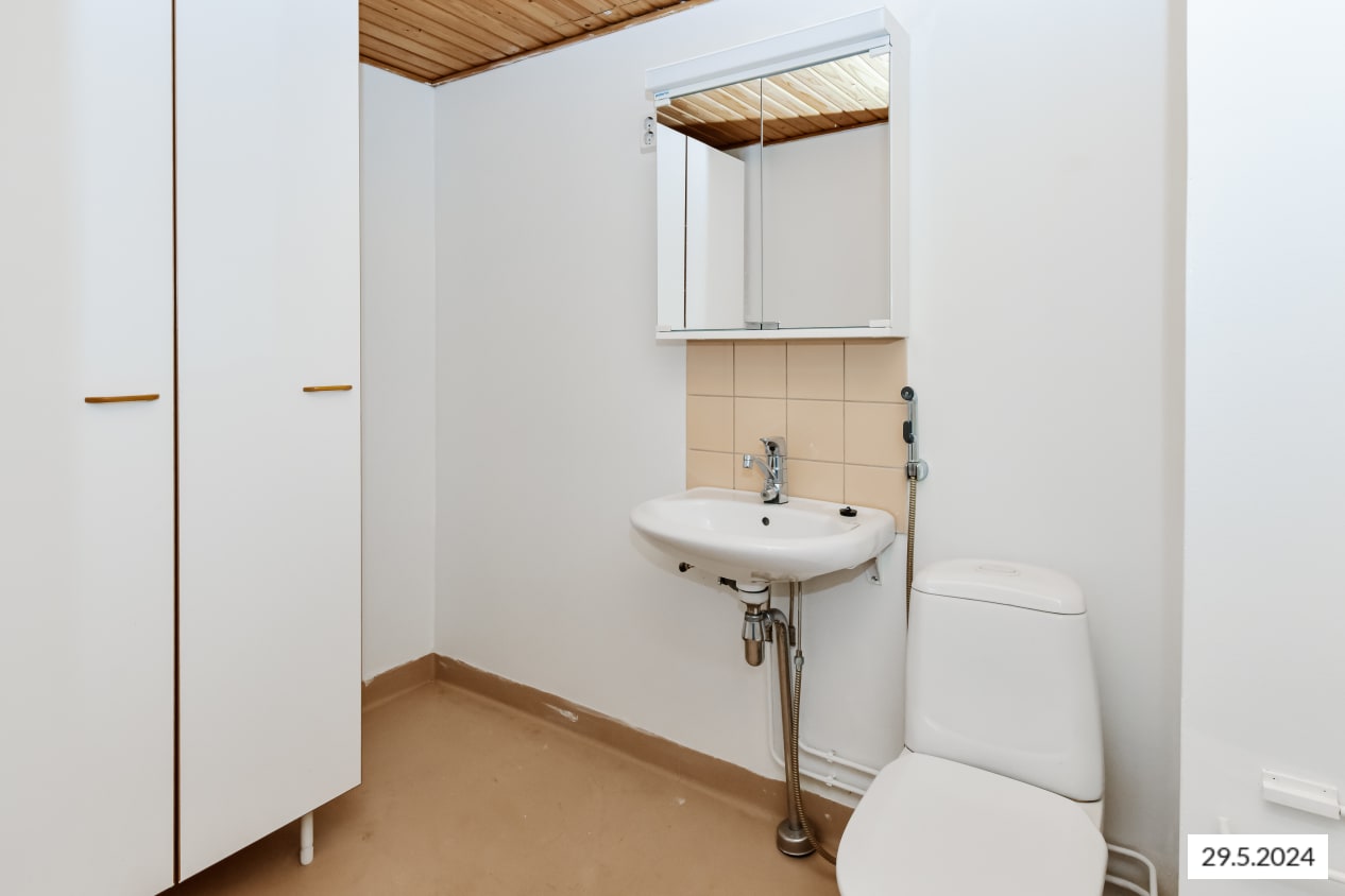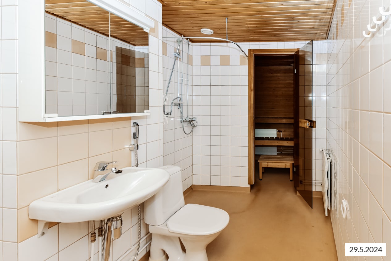 The apartment features a WC, bathroom, and sauna. A separate walk-in closet provides ample storage space and helps keep things organized.