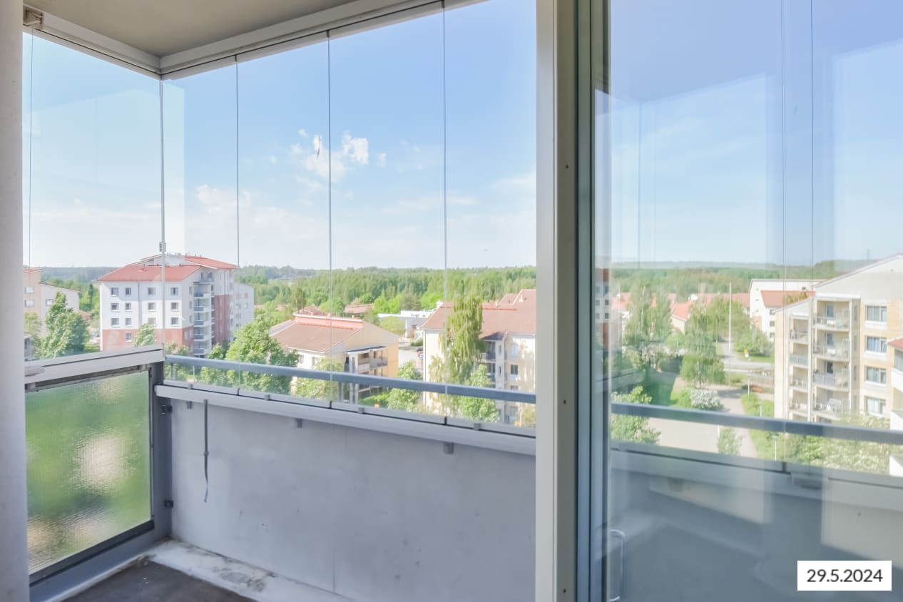 The flooring is light-colored vinyl, and the walls are painted white. The glazed balcony offers views over the rooftops and provides additional living space from spring through late autumn.