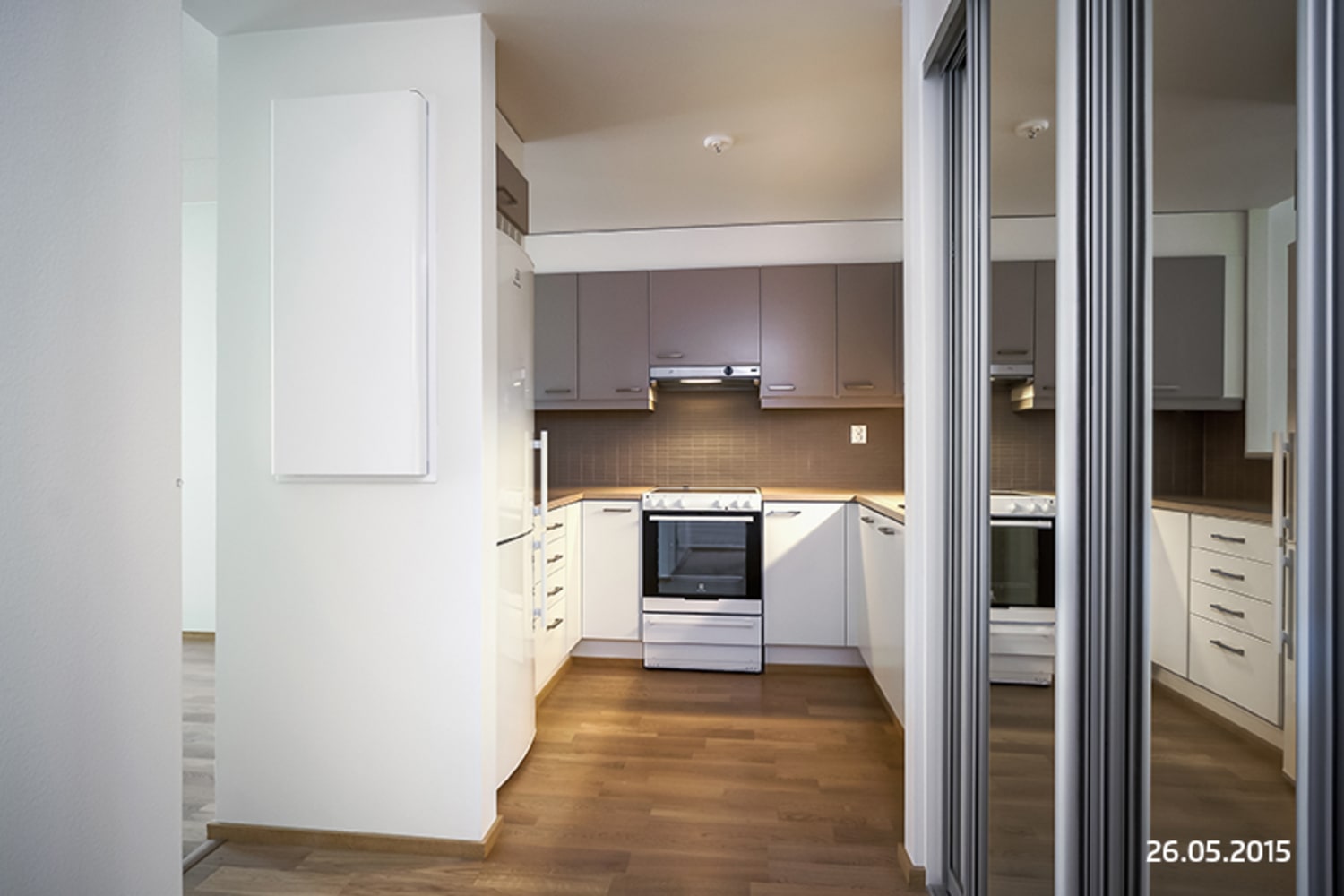 Decorated in light colours, these homes have floors laid in white-varnished oak parquet, and the entrance halls feature storage units with sliding mirrored doors. Kitchen base unit and tall cabinet doors are white and wall unit doors pale brown. The splashbacks are tiled in pale brown. The worktops are pale oak-toned laminate. The kitchen appliances comprise a ceramic cooker, built-in oven, integrated dishwasher, and fridge-freezer. Bathroom walls are tiled in white with a grey accent wall. The floors are tiled in grey. There is space for a washing machine and dryer. The ground floor apartments have garden areas, while those on higher floors have glassed-in balconies.