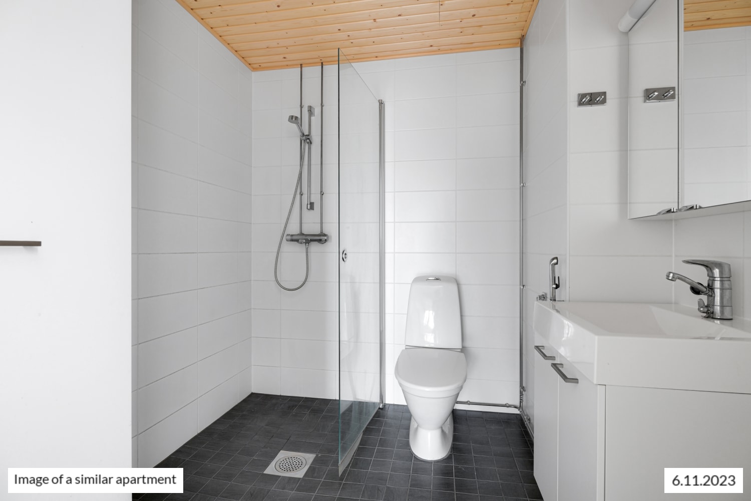 The spacious, tiled bathroom has a fresh finish and also accommodates a washing machine. A convenient laundry sorting cabinet simplifies laundry chores.