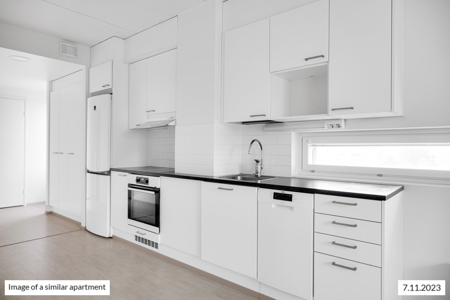 The light-toned kitchen is equipped with a dishwasher, ceramic hob, and refrigerator.
