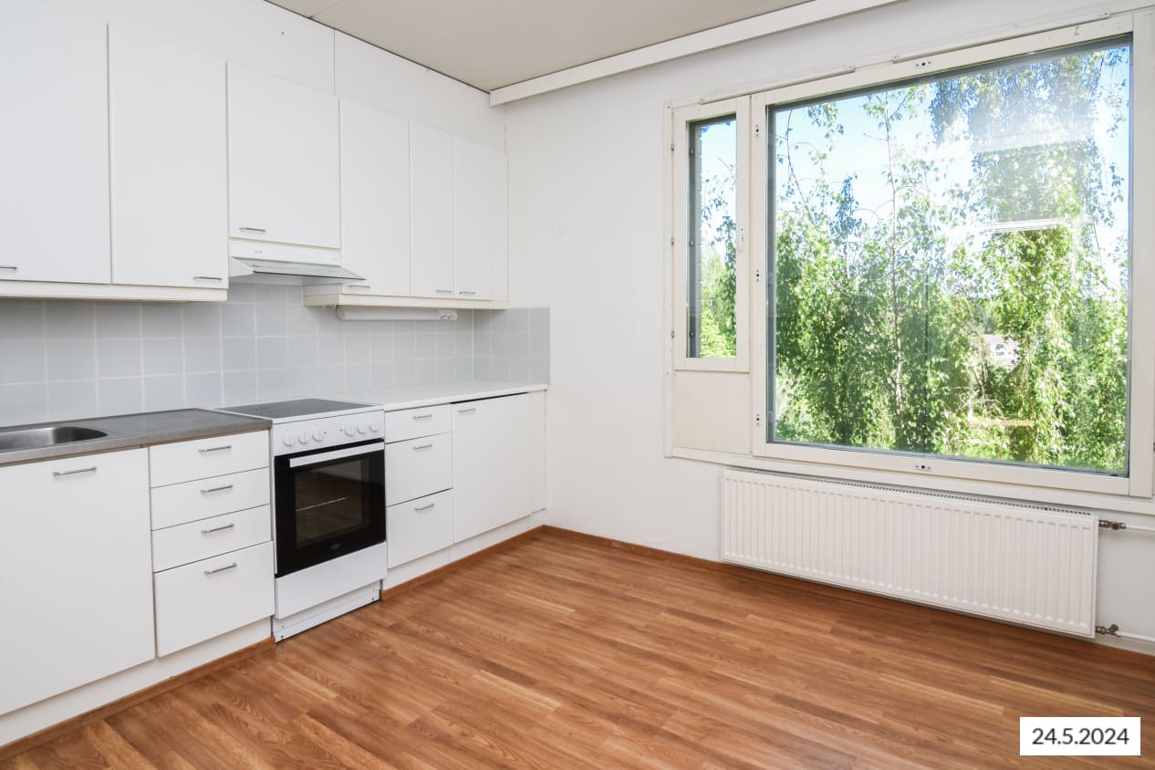The separate kitchen offers plenty of cupboard space and room for a dining table by the window. The kitchen cupboards are white, and the space between them is tiled with grey tiles. The equipment includes a dishwasher, cooker, and freezer-refrigerator, with space reserved for an additional cooling appliance and a microwave.