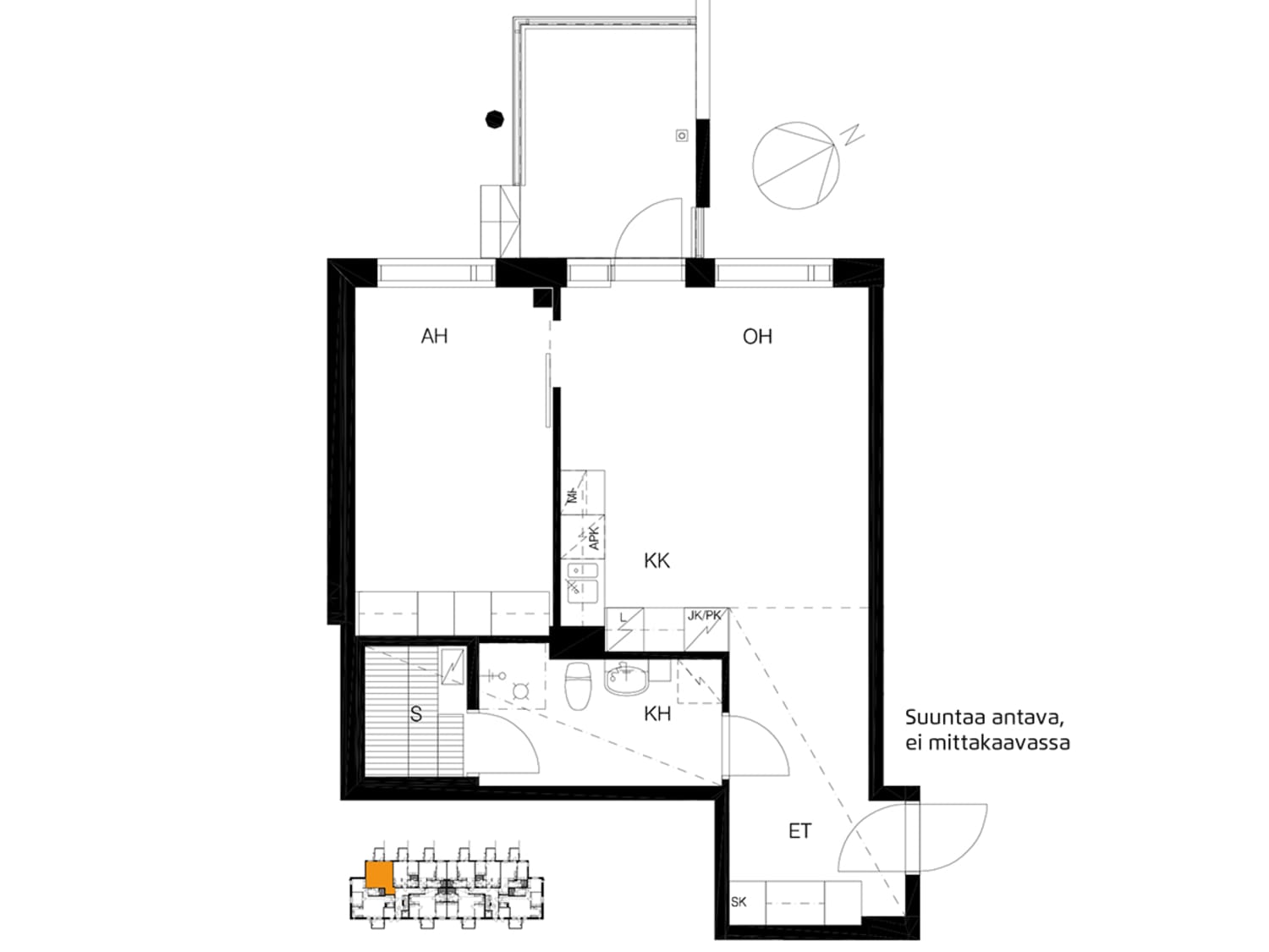 The layouts of these apartments with a light colour scheme are practical and easy to furnish. The apartments have a glassed-in balcony or access to a terrace from a ground-level balcony. The floors are in laminate and the kitchen units are fresh white in colour. The kitchens are equipped with ceramic cooktops, dishwashers and refrigeration appliances. The bathrooms are laid in pale grey tiles and have space and hookups for a washing machine.