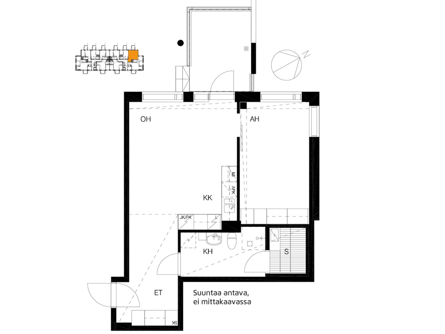 The layouts of these apartments with a light colour scheme are practical and easy to furnish. The apartments have a glassed-in balcony or access to a terrace from a ground-level balcony. The floors are in laminate and the kitchen units are fresh white in colour. The kitchens are equipped with ceramic cooktops, dishwashers and refrigeration appliances. The bathrooms are laid in pale grey tiles and have space and hookups for a washing machine.