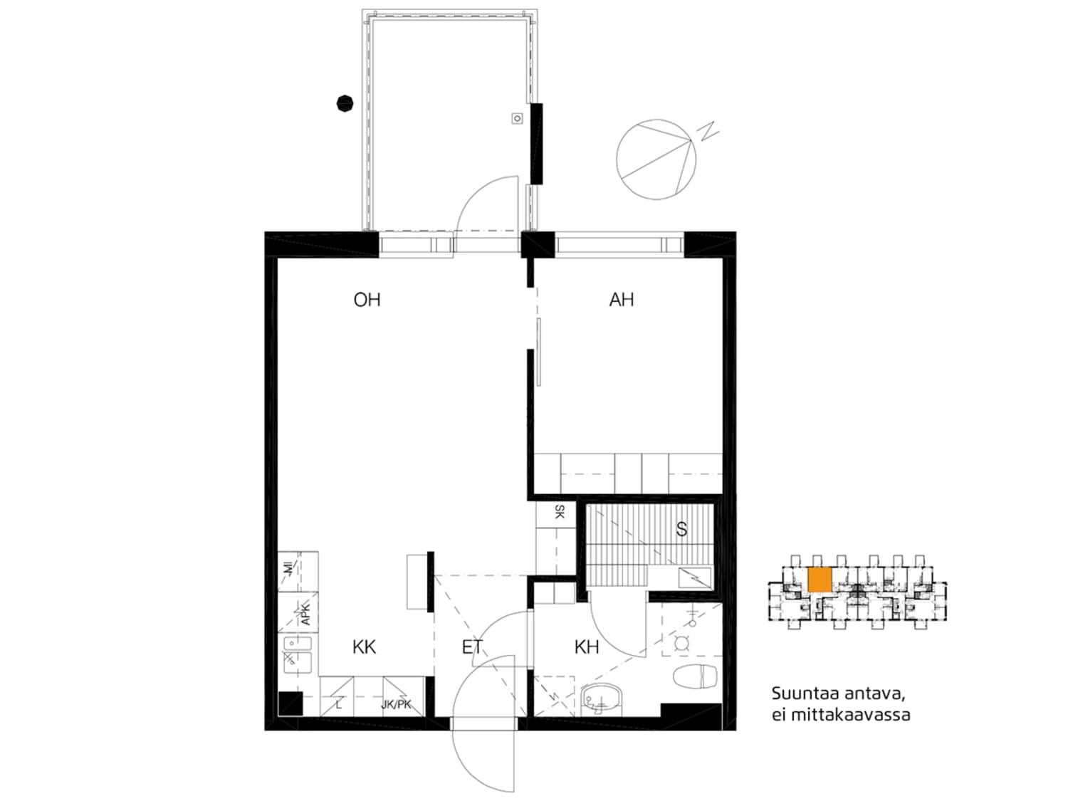 The layouts of these apartments with a light colour scheme are practical and easy to furnish. The apartments have a glassed-in balcony or access to a terrace from a ground-level balcony. The floors are in laminate and the kitchen units are fresh white in colour. The kitchens are equipped with ceramic cooktops, dishwashers and refrigeration appliances. The bathrooms are laid in pale grey tiles and have space and hookups for a washing machine.