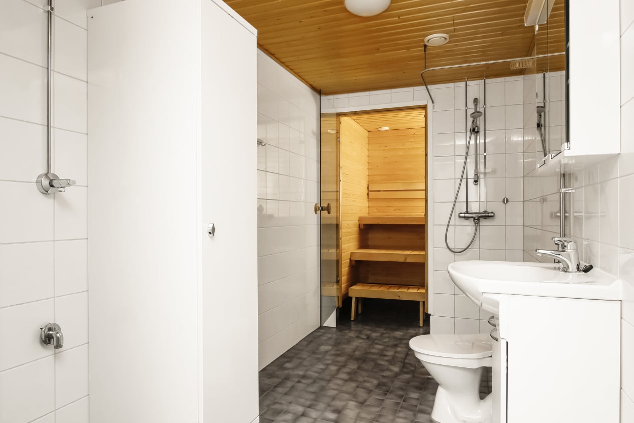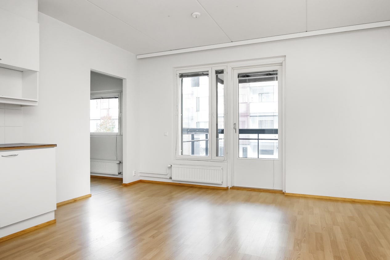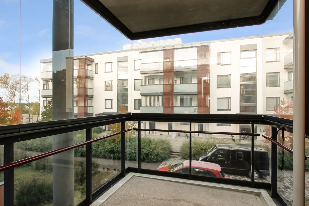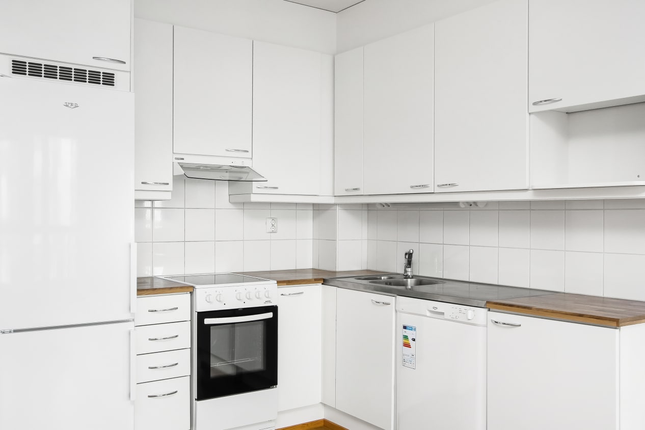 The layouts of these apartments with a light colour scheme are practical and easy to furnish. The apartments have a glassed-in balcony or access to a terrace from a ground-level balcony. The floors are in laminate and the kitchen units are fresh white in colour. The kitchens are equipped with ceramic cooktops, dishwashers and refrigeration appliances. The bathrooms are laid in pale grey tiles and have space and hookups for a washing machine.