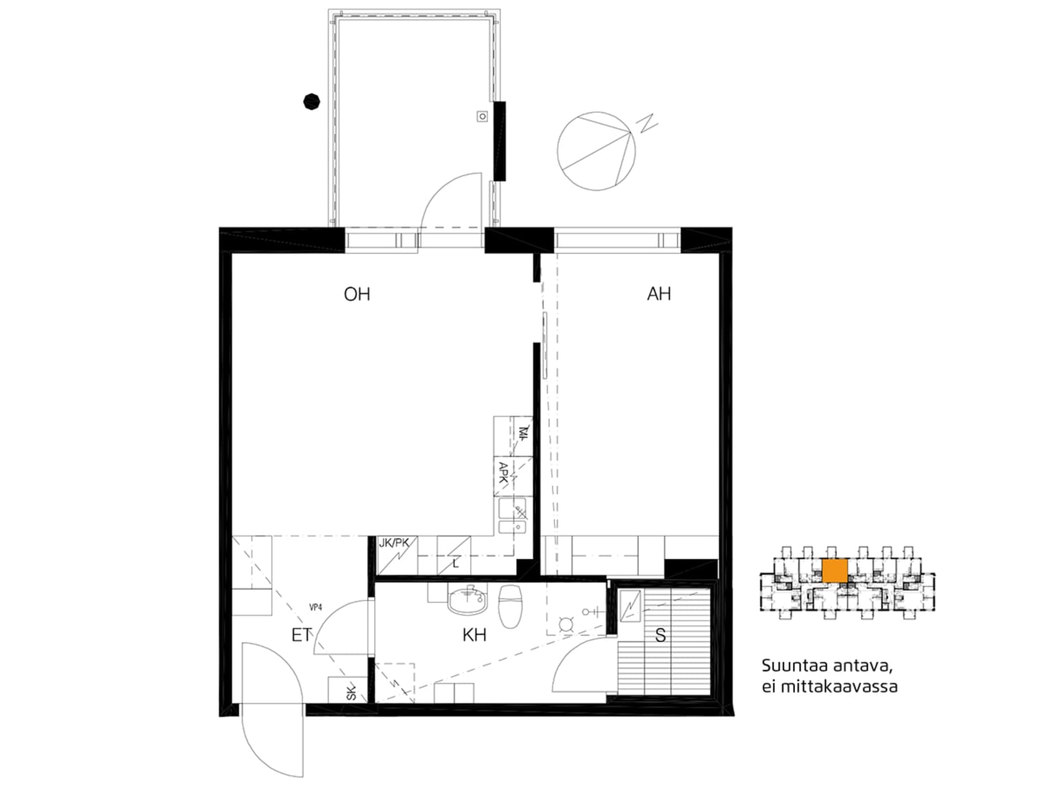 The layouts of these apartments with a light colour scheme are practical and easy to furnish. The apartments have a glassed-in balcony or access to a terrace from a ground-level balcony. The floors are in laminate and the kitchen units are fresh white in colour. The kitchens are equipped with ceramic cooktops, dishwashers and refrigeration appliances. The bathrooms are laid in pale grey tiles and have space and hookups for a washing machine.