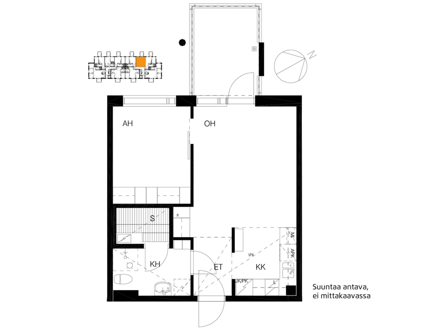 The layouts of these apartments with a light colour scheme are practical and easy to furnish. The apartments have a glassed-in balcony or access to a terrace from a ground-level balcony. The floors are in laminate and the kitchen units are fresh white in colour. The kitchens are equipped with ceramic cooktops, dishwashers and refrigeration appliances. The bathrooms are laid in pale grey tiles and have space and hookups for a washing machine.