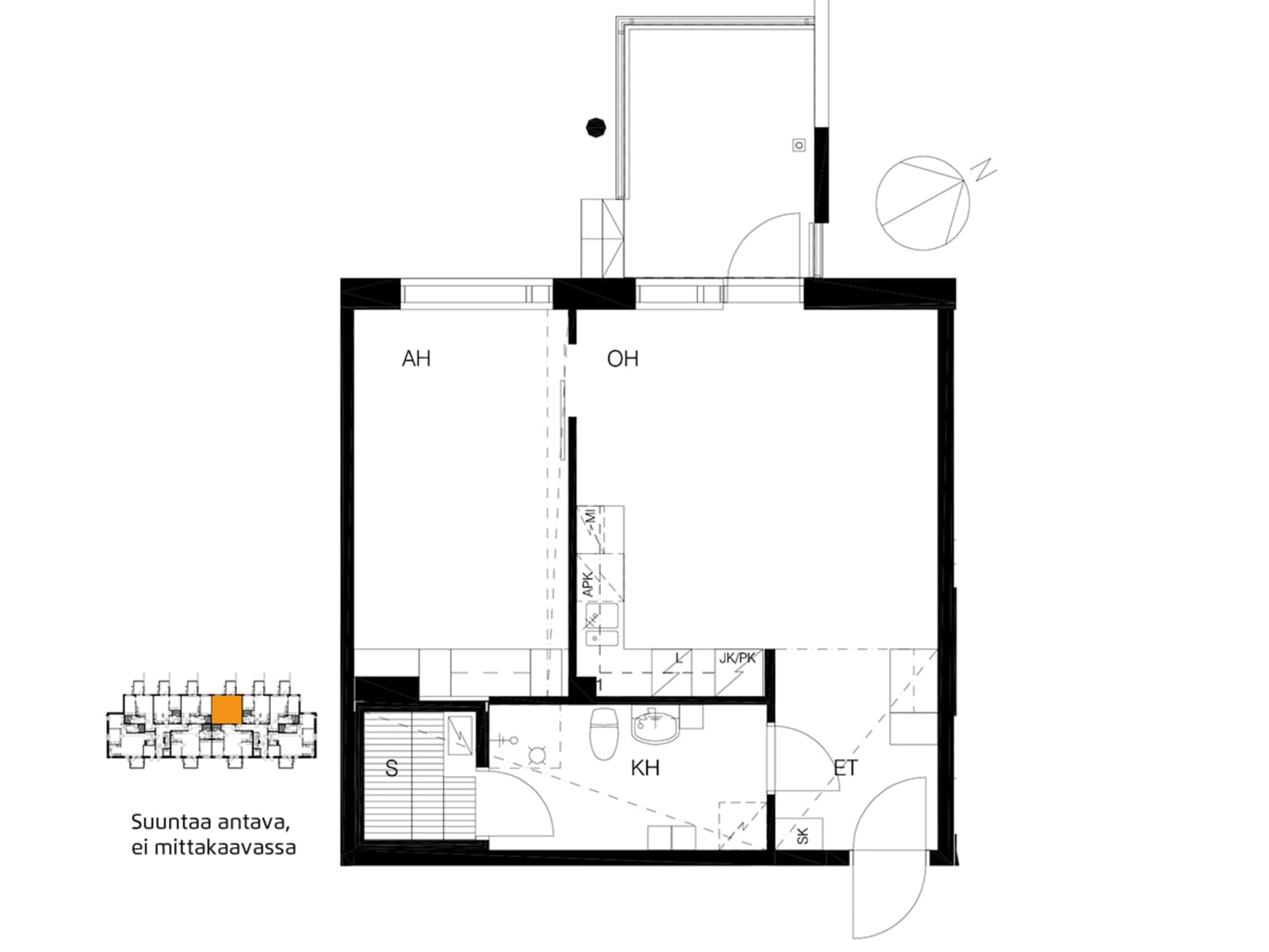 The layouts of these apartments with a light colour scheme are practical and easy to furnish. The apartments have a glassed-in balcony or access to a terrace from a ground-level balcony. The floors are in laminate and the kitchen units are fresh white in colour. The kitchens are equipped with ceramic cooktops, dishwashers and refrigeration appliances. The bathrooms are laid in pale grey tiles and have space and hookups for a washing machine.