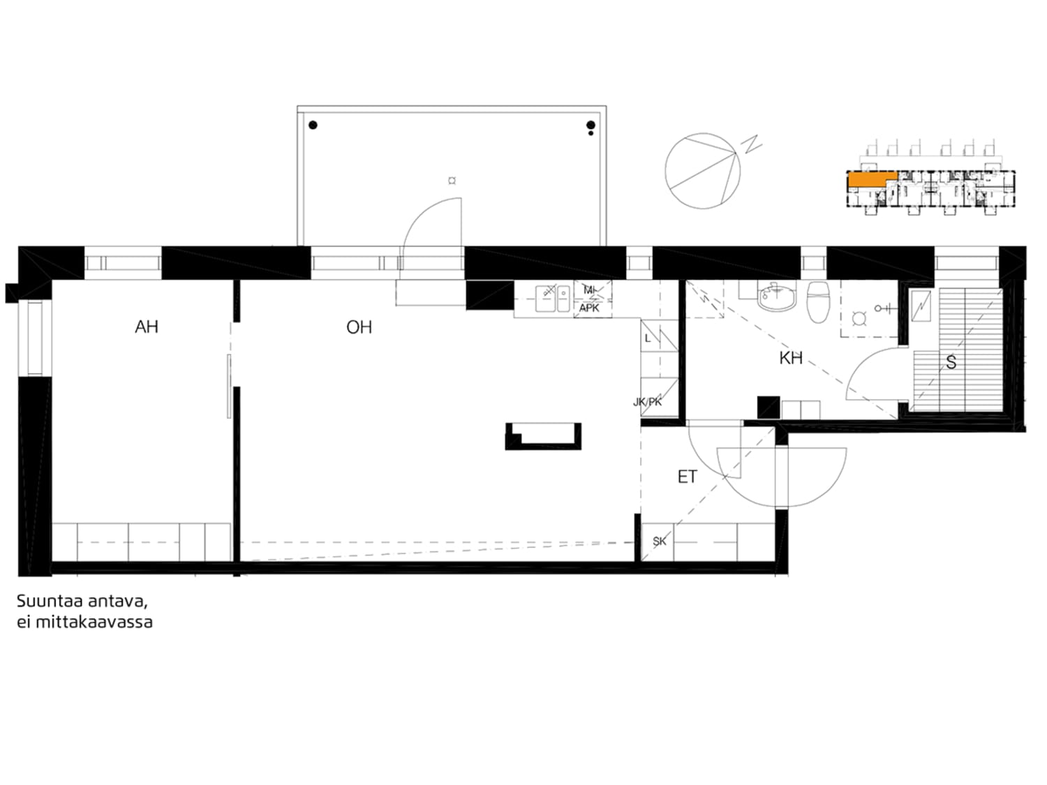 The layouts of these apartments with a light colour scheme are practical and easy to furnish. The apartments have a glassed-in balcony or access to a terrace from a ground-level balcony. The floors are in laminate and the kitchen units are fresh white in colour. The kitchens are equipped with ceramic cooktops, dishwashers and refrigeration appliances. The bathrooms are laid in pale grey tiles and have space and hookups for a washing machine.