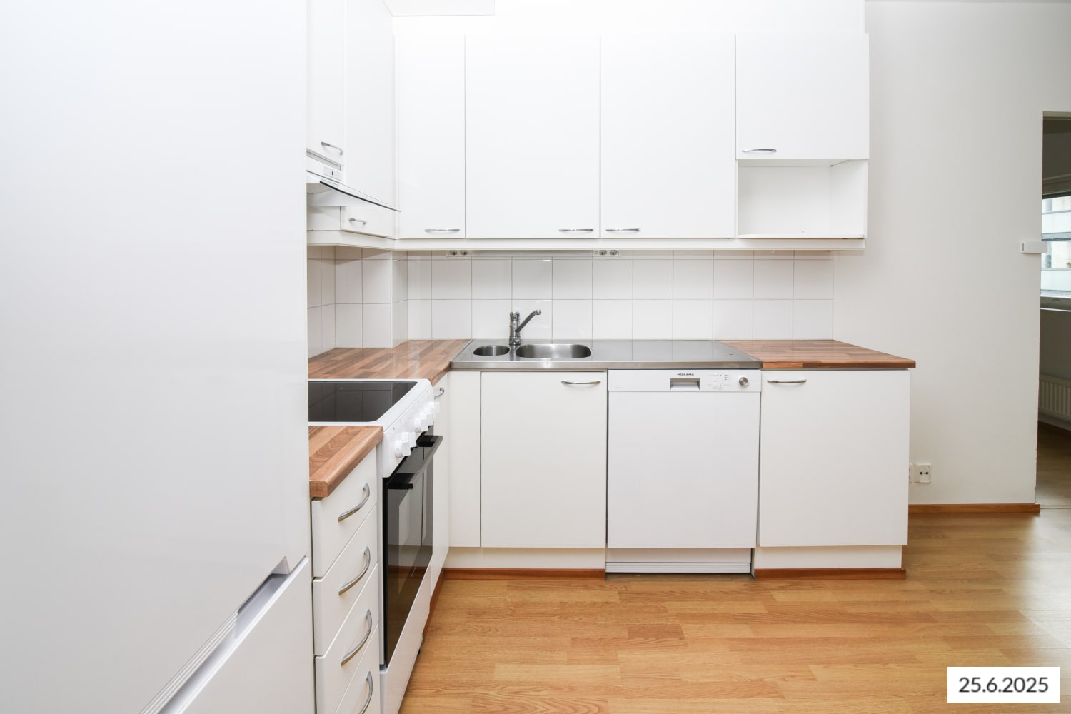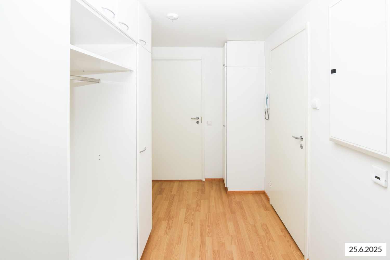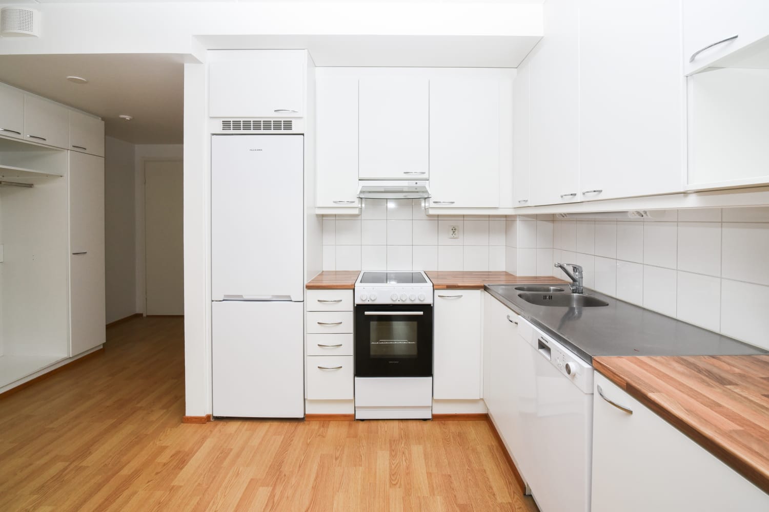 The layouts of these apartments with a light colour scheme are practical and easy to furnish. The apartments have a glassed-in balcony or access to a terrace from a ground-level balcony. The floors are in laminate and the kitchen units are fresh white in colour. The kitchens are equipped with ceramic cooktops, dishwashers and refrigeration appliances. The bathrooms are laid in pale grey tiles and have space and hookups for a washing machine.