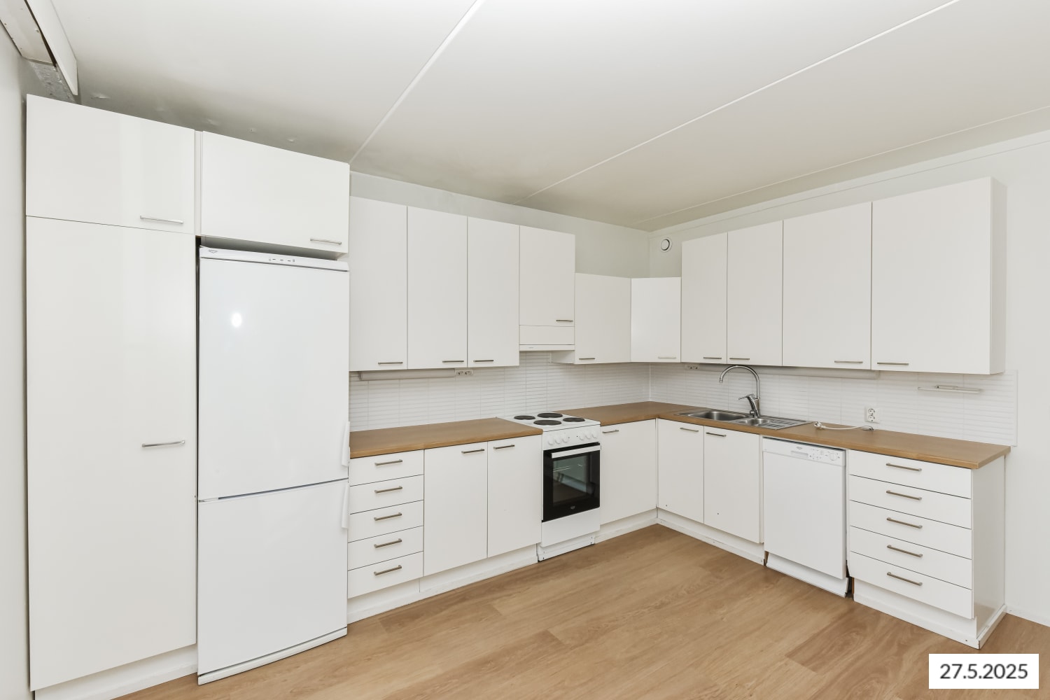 The separate kitchen accommodates a proper dining table cozily by the window. It is equipped with a dishwasher, freezer-refrigerator, and stove with an extractor fan.