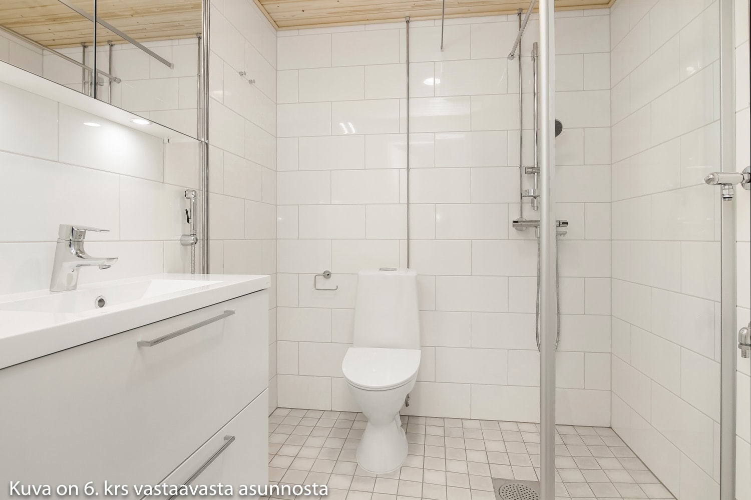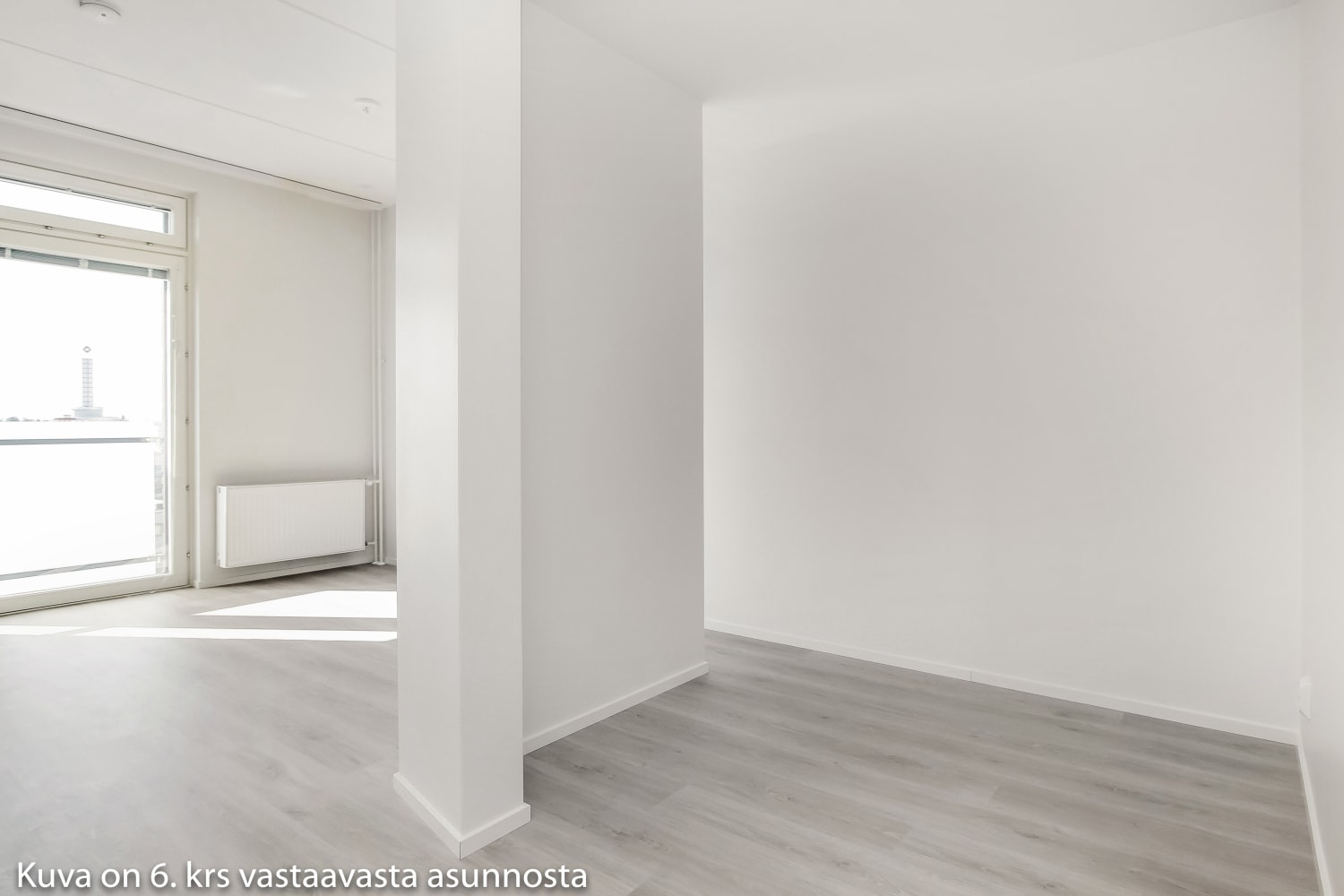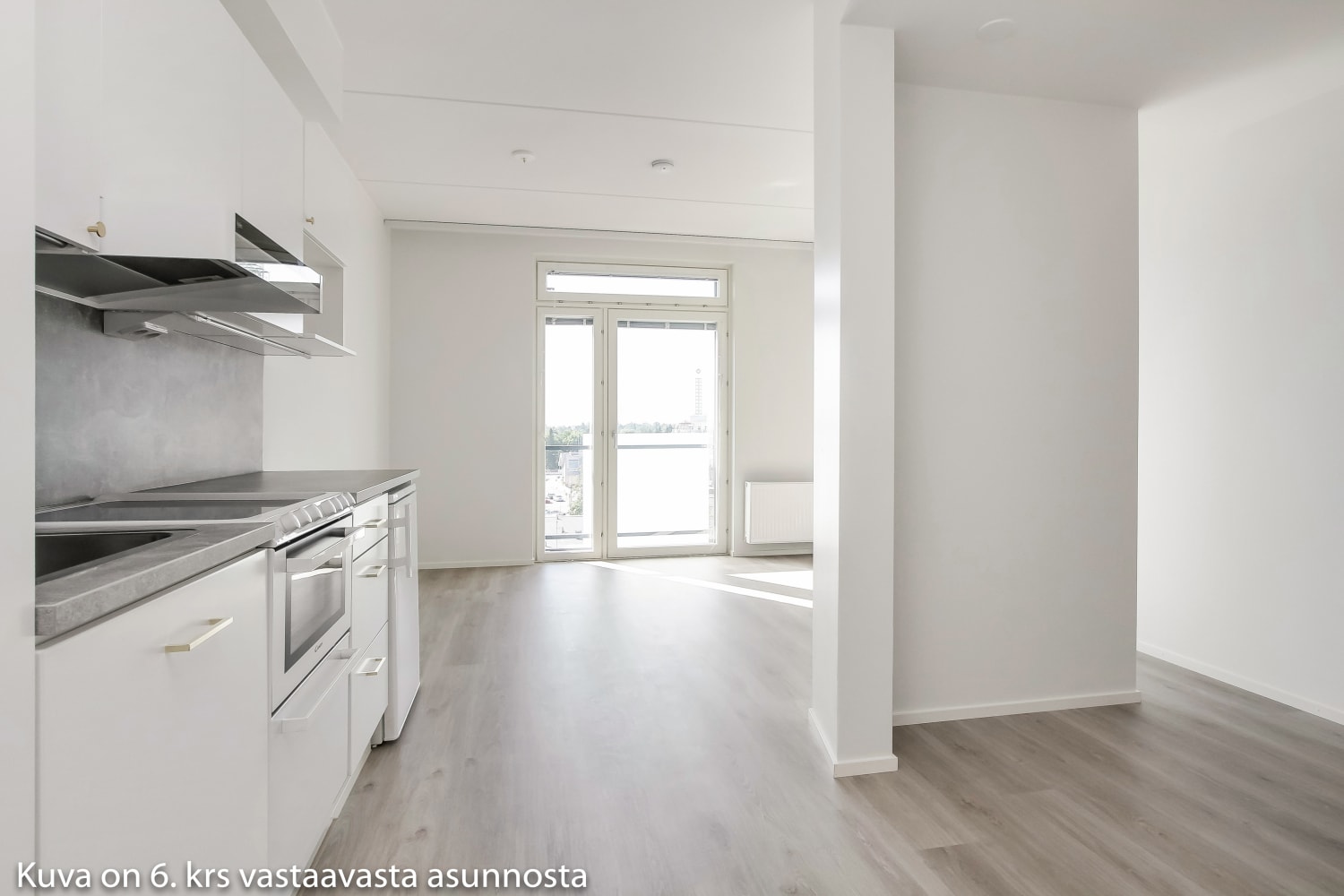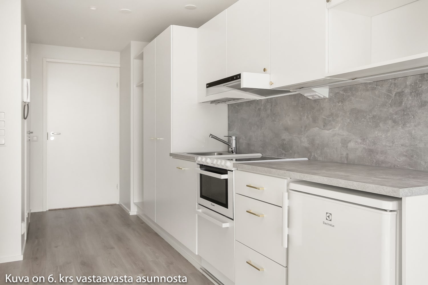 This charming compact home boasts a clear and open layout. The kitchen and living room blend into a cozy living area, easy to furnish for a homely feel. The space features light laminate flooring and white-painted walls. All cabinets, including kitchen and closet storage, are by the Finnish brand Kankarin Kaluste. The kitchen has fresh white cabinet doors with brushed brass handles, a gray laminate backsplash, and matching countertops. Appliances include a refrigerator and stove. The fully-tiled bathroom has white walls, light gray flooring, and white fixtures, with hookups for a washing machine and dryer. The home is brightened by a south-facing French balcony, perfect for a touch of fresh air.