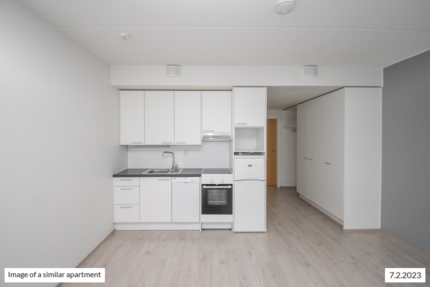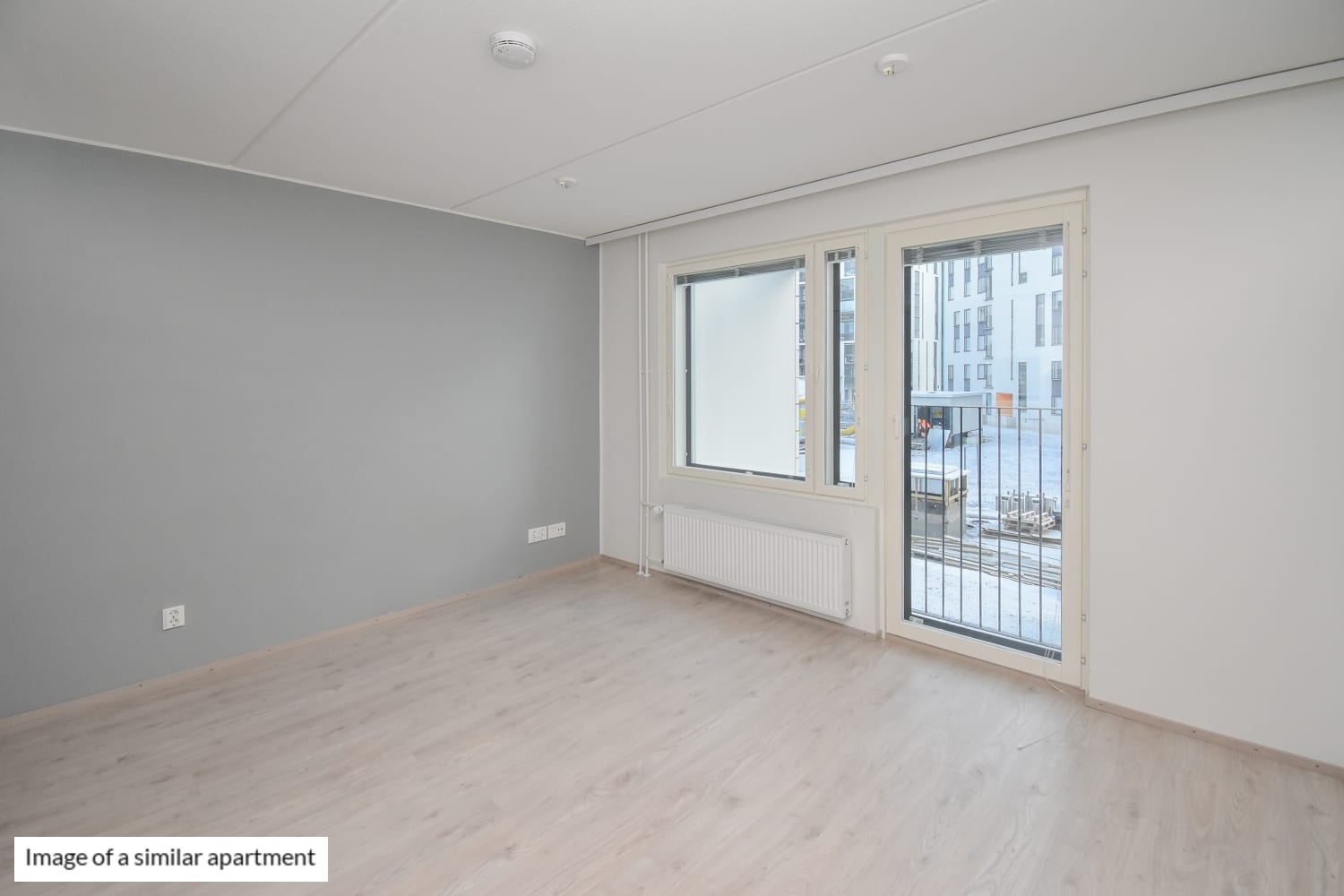 This modern studio apartment has everything you need for comfortable living. The living room and kitchen area form a unified space that can be easily furnished to your liking. By opening the juliet balcony door, you can enjoy fresh air while having your morning coffee. The windows have blinds.