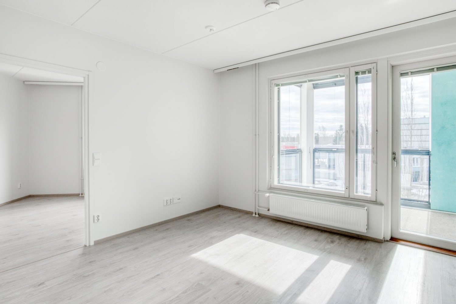 This light-toned one-bedroom home features subtle coloured laminate floors and tiled surfaces in the bathrooms. The kitchen seamlessly connects to the living area, which you can extend to the glazed balcony in the summer. Windows are equipped with venetian blinds.