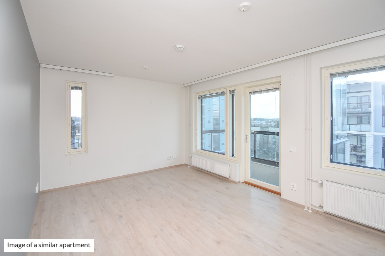 The light-toned apartments in Vantaan Välke feature laminate flooring and tiled surfaces in the bathrooms. One wall in each apartment has a grey accent color, adding character to the interior. Each apartment includes either a glazed balcony or a French balcony, and the windows are fitted with venetian blinds. The kitchens are equipped with a ceramic cooktop, dishwasher, and fridge-freezer. The bathrooms have electric underfloor comfort heating.