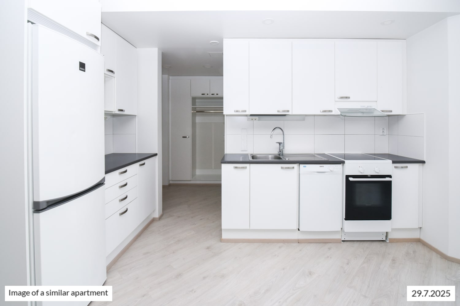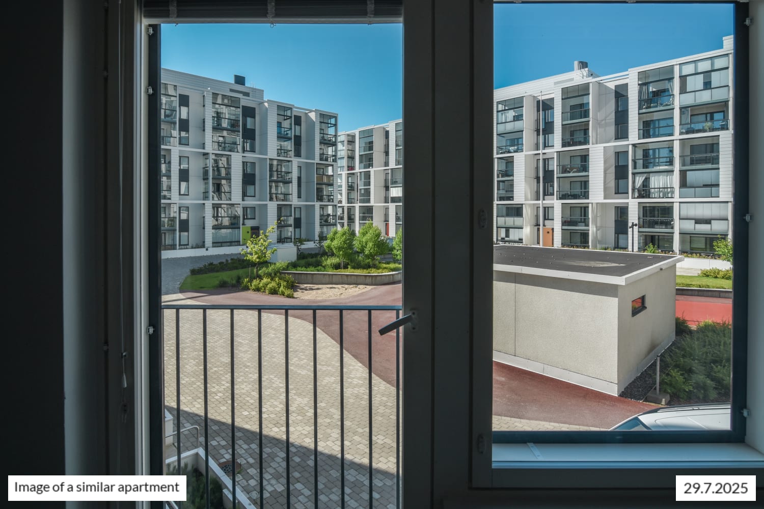 The light-toned apartments in Vantaan Välke feature laminate flooring and tiled surfaces in the bathrooms. One wall in each apartment has a grey accent color, adding character to the interior. Each apartment includes either a glazed balcony or a French balcony, and the windows are fitted with venetian blinds. The kitchens are equipped with a ceramic cooktop, dishwasher, and fridge-freezer. The bathrooms have electric underfloor comfort heating.