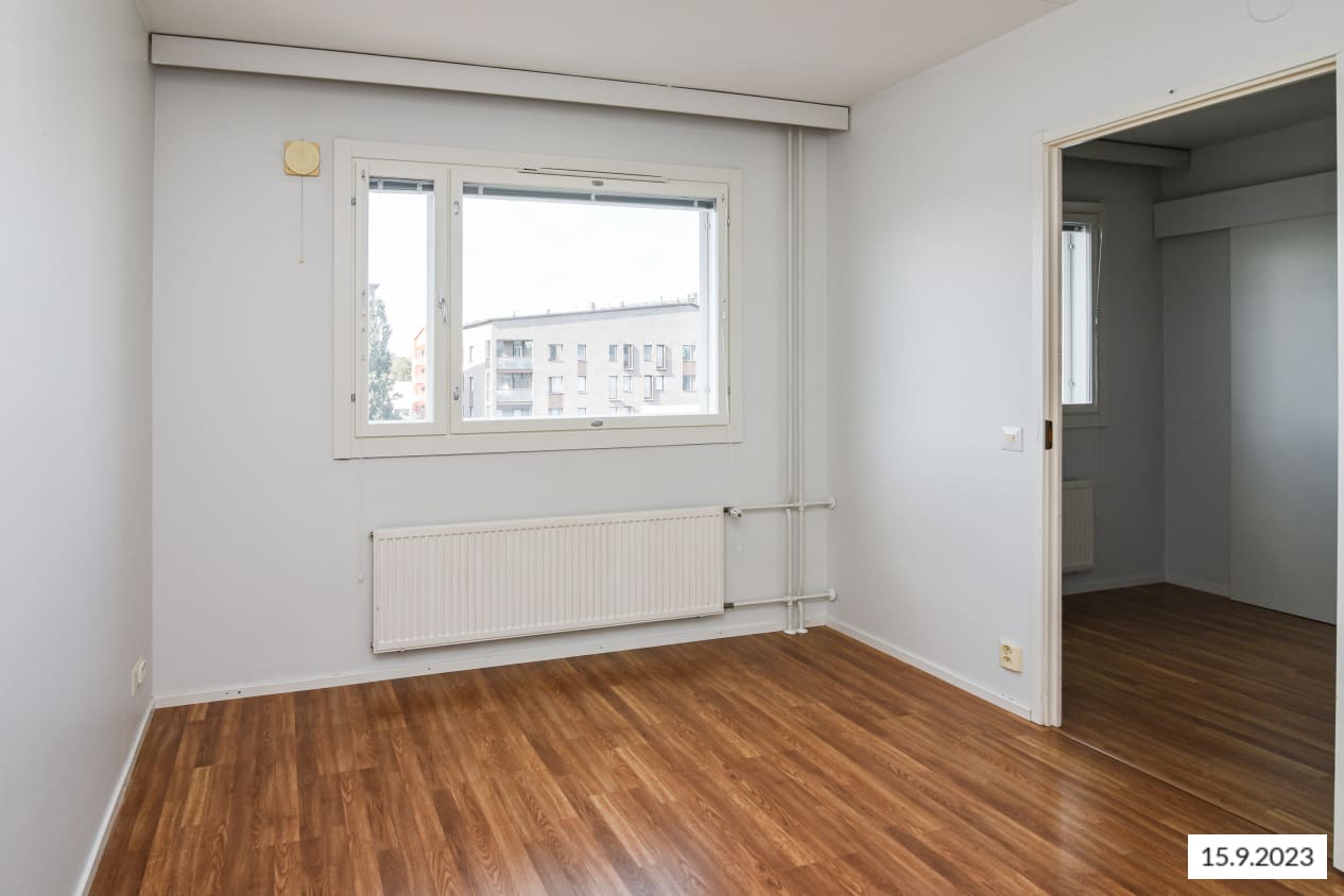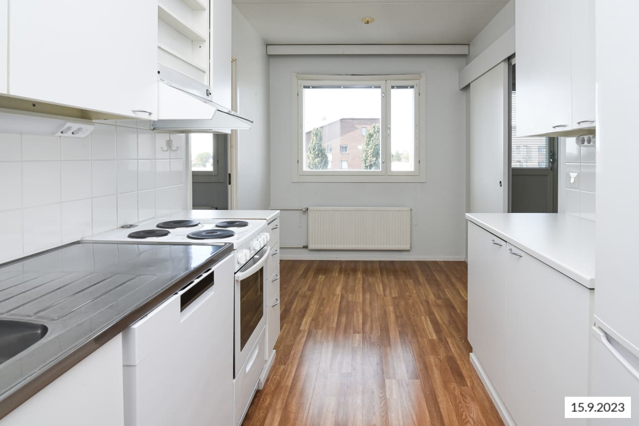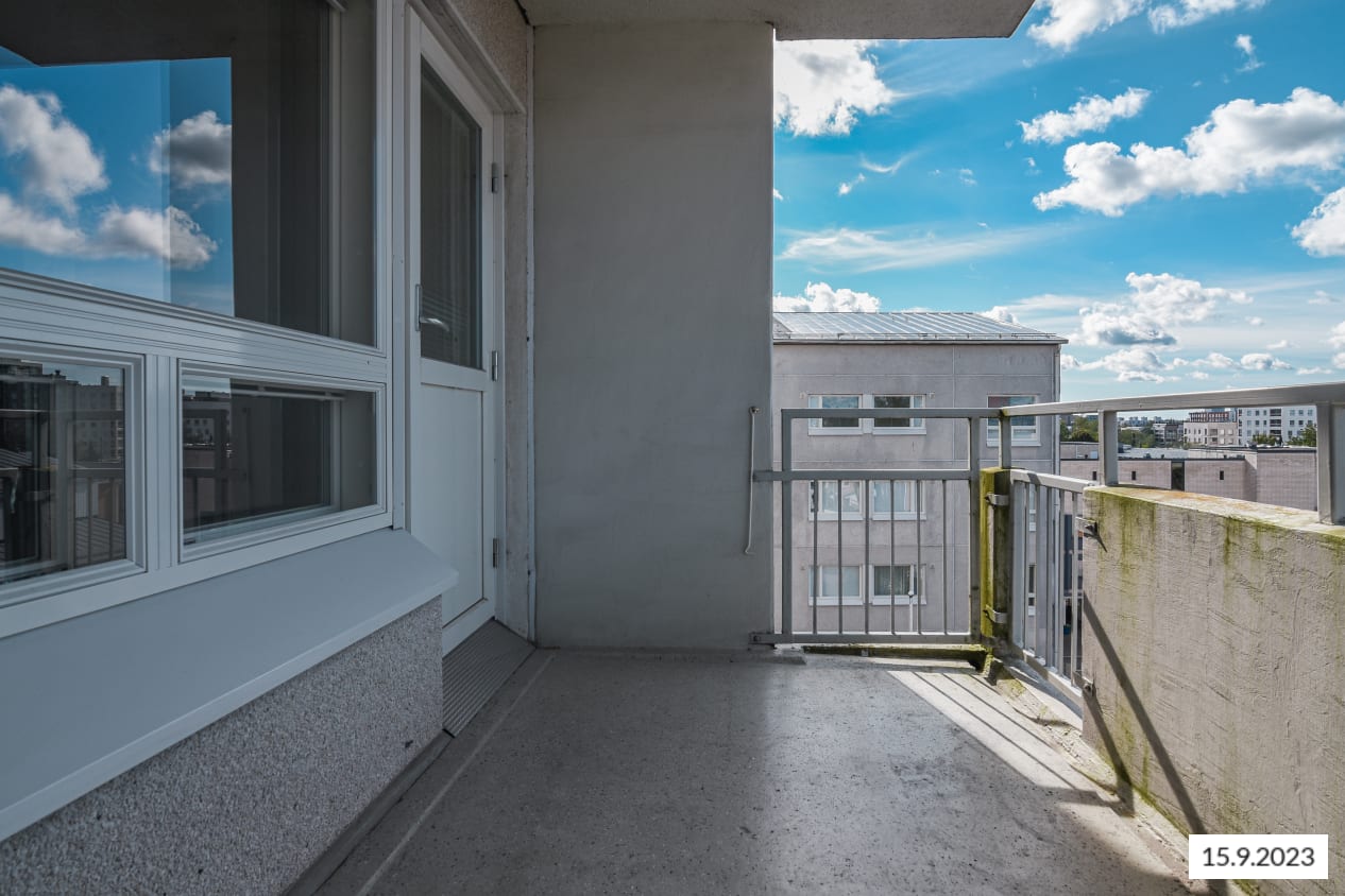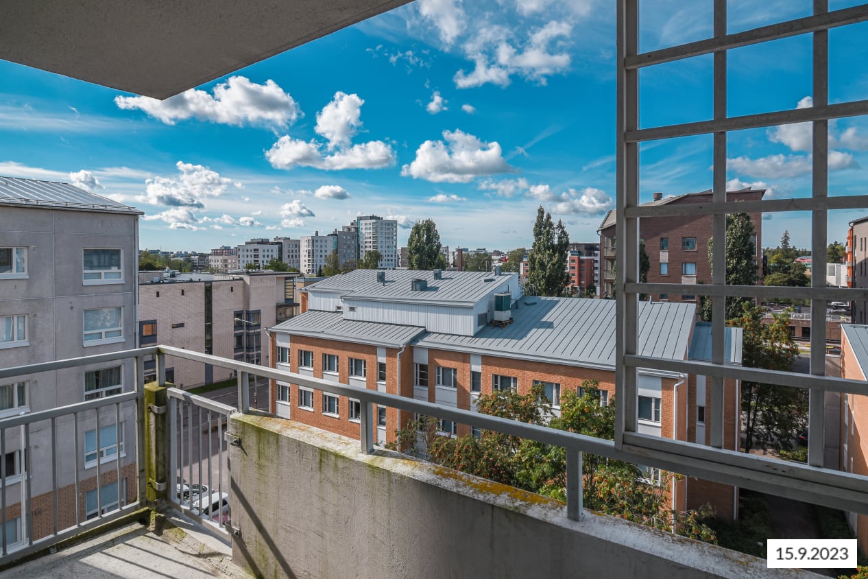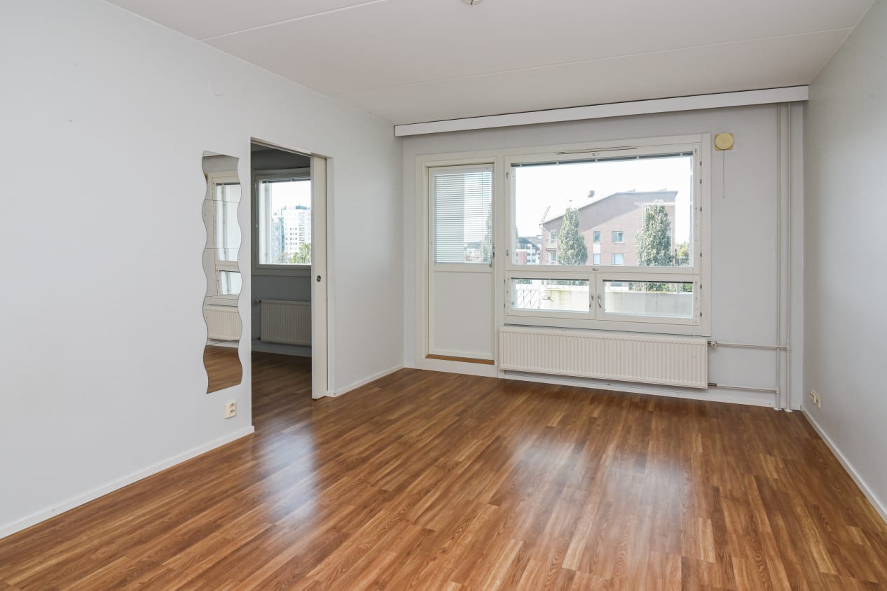 Just a few steps from Tikkurila train station, this spacious one-bedroom apartment features a balcony. The kitchen, slightly separated from the living room, has space for a dining table by the window. The bedroom is accessed through the kitchen, while the balcony is reached from the living room.