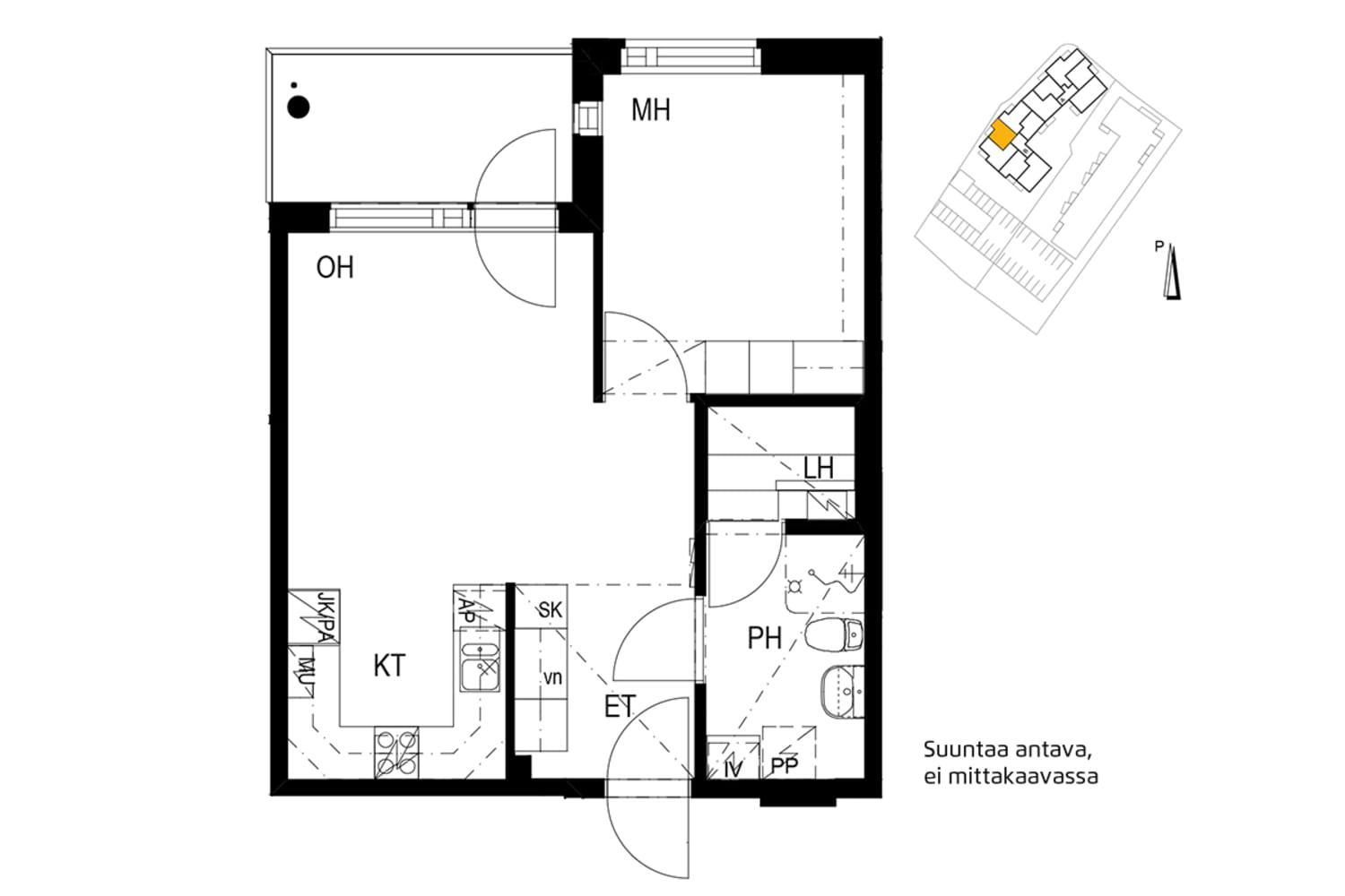 The heart of the one-bedroom home is the spacious living area formed by the open kitchen and living room, enhanced by the light and airiness provided by the balcony.