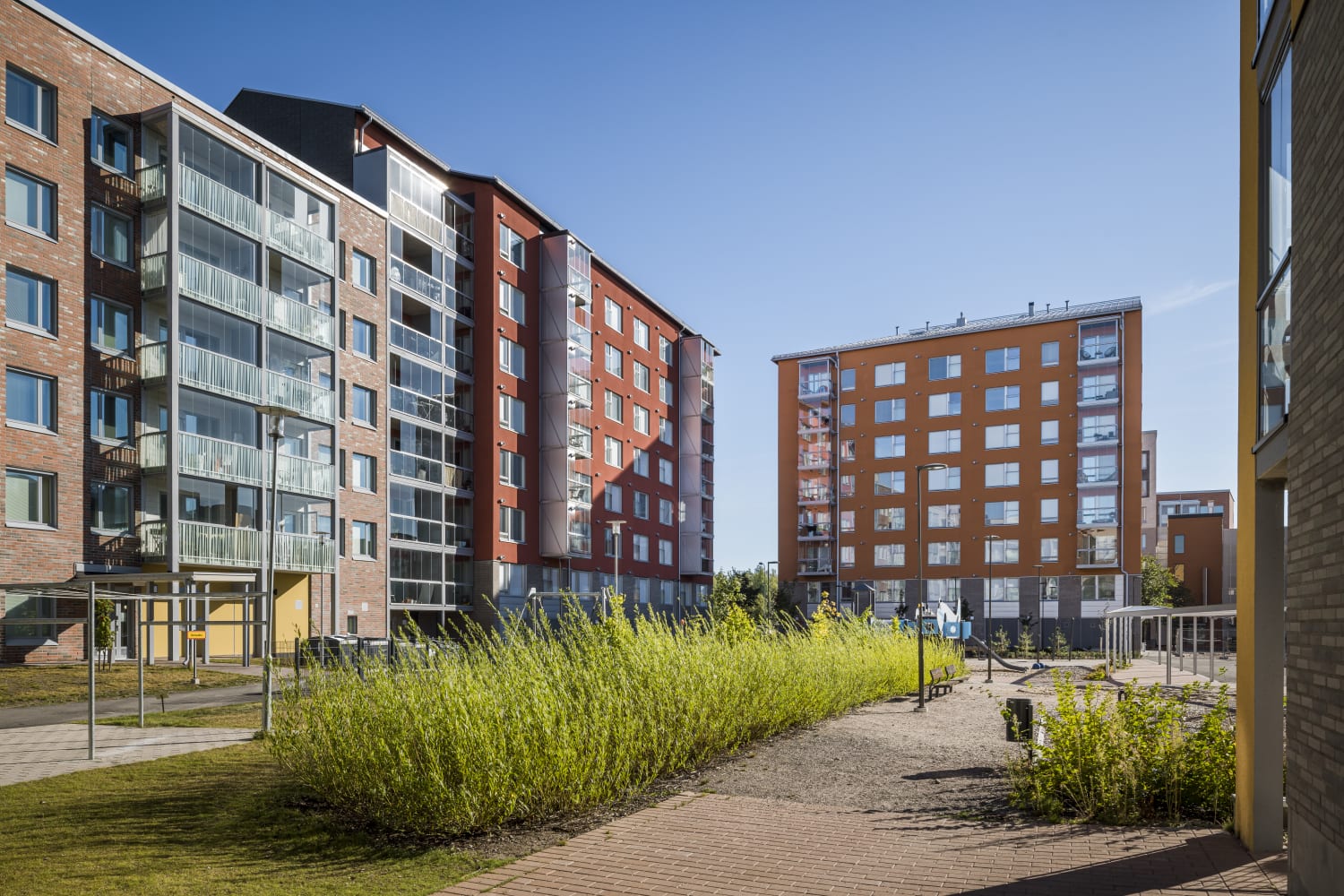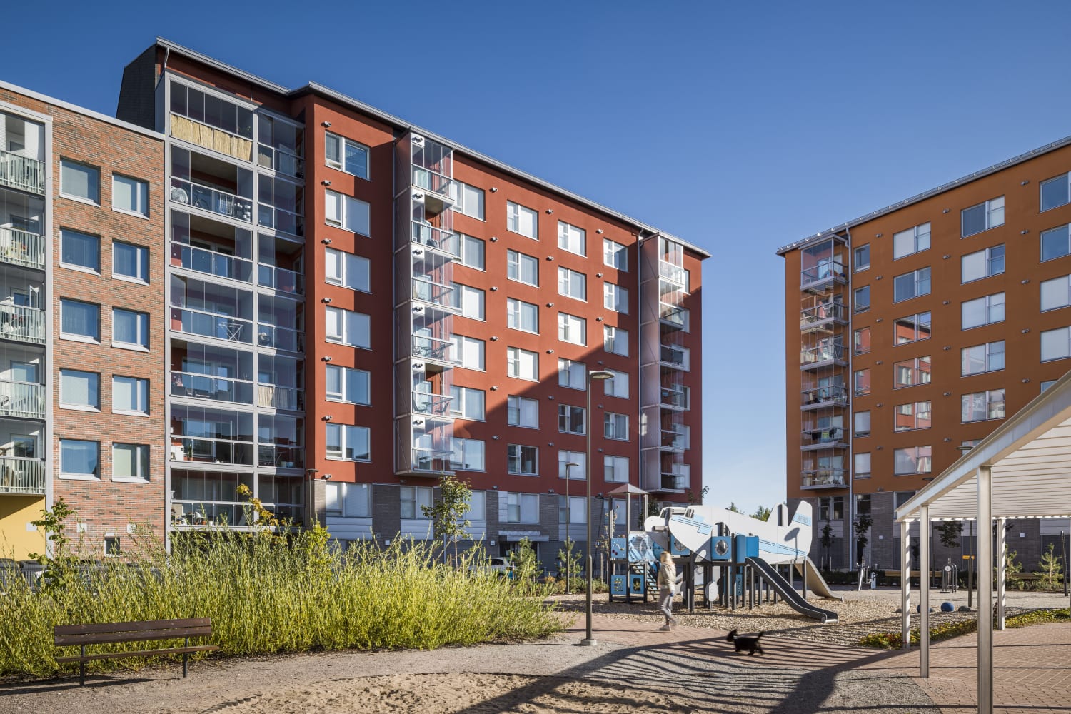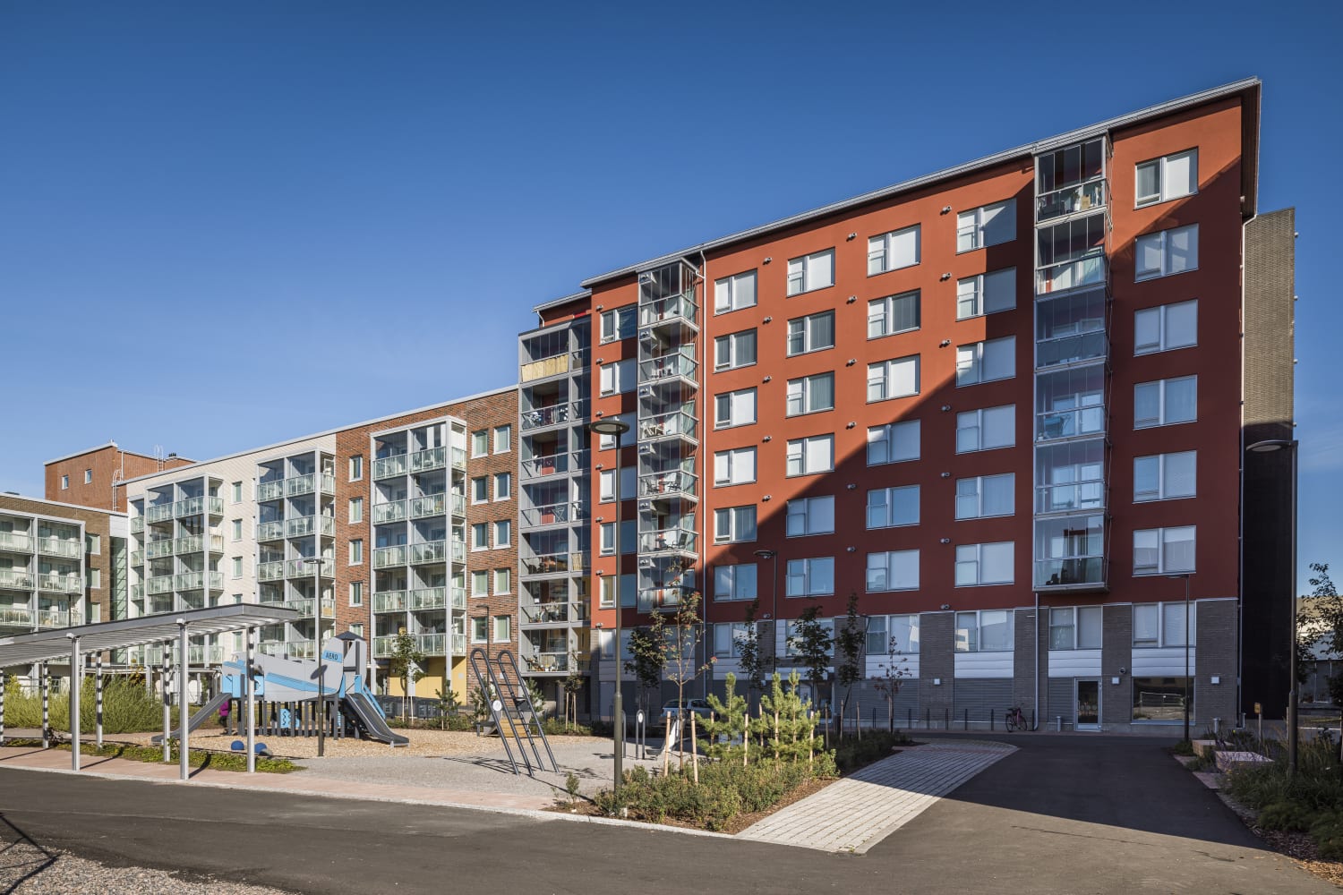 The warm-toned red façade welcomes you to Asunto Oy Vantaan Pilotti in Veromies, Vantaa, an eight-storey apartment building with a lift completed in 2022. The building comprises 84 apartments and one commercial space. The location offers excellent transport connections both to the airport and across the Helsinki metropolitan area via Ring III. Nearby, you will also find a wide range of services, including the Jumbo shopping centre and Flamingo entertainment complex.