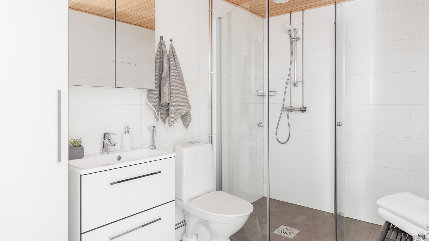 Kylpyhuoneessa sekä erillisessä WC:ssä on hiekan vaaleat lattiat ja kirkkaan valkoiset, kiiltävät seinälaatat. Molemmissa huoneissa on SATOn Kide-malliston valkoiset kalusteet ja kylpyhuoneesta löytyy pyyhekaappi pesukone- ja kuivausrumpupaikan vierestä.