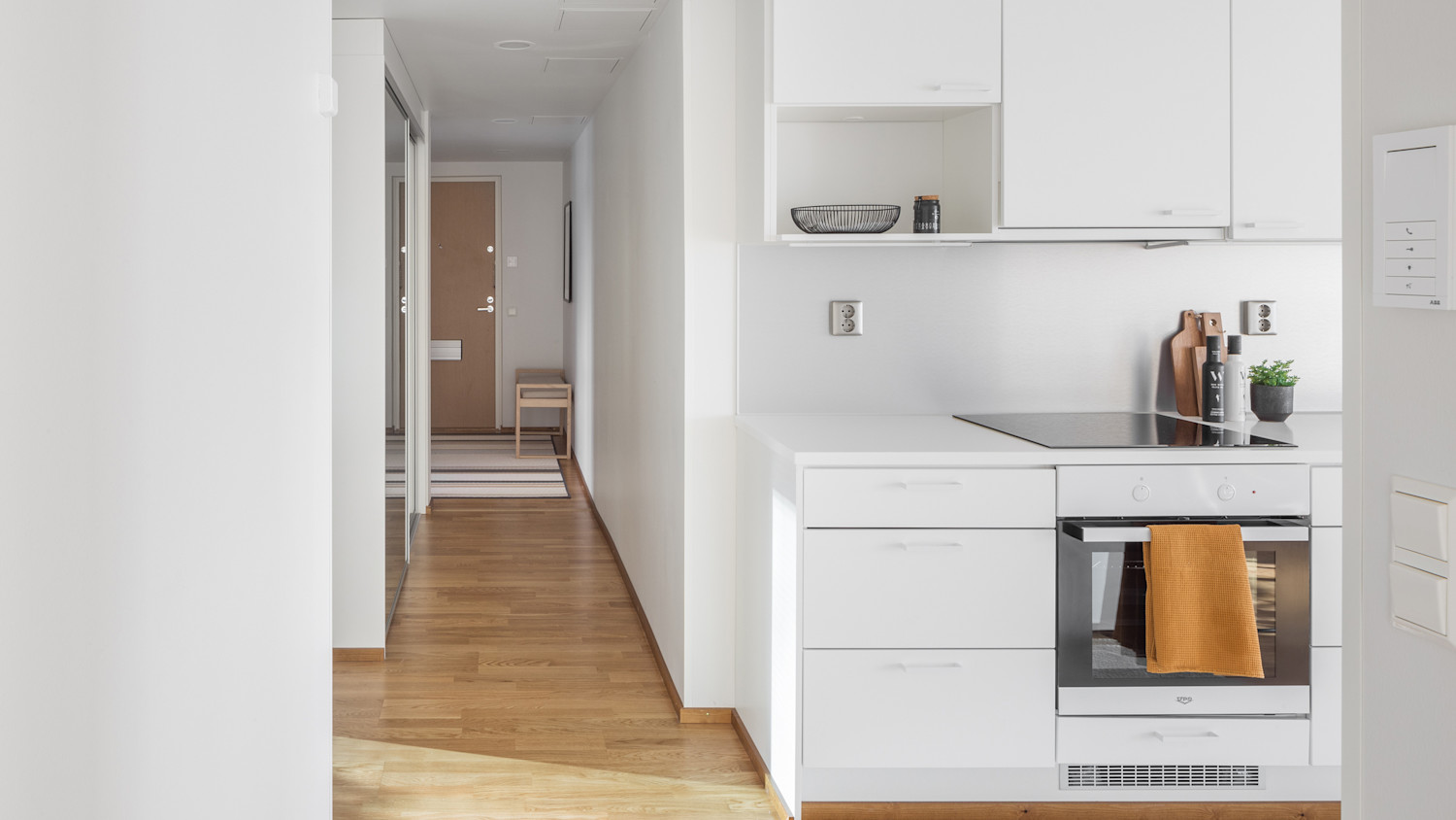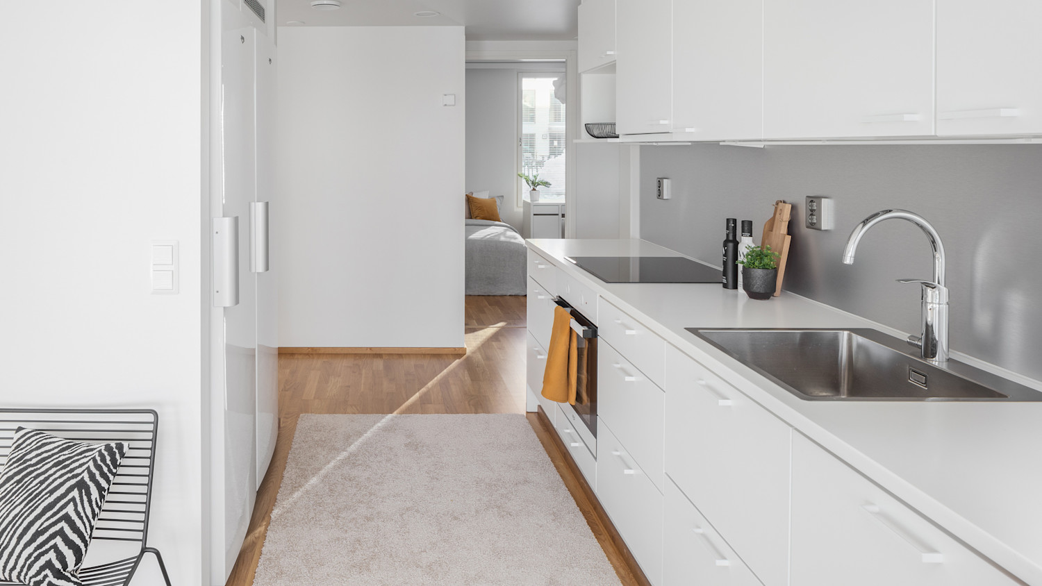 Keittiön pinnat ja kodinkoneet ovat valkoiset. Välitila tuo kuitenkin tasapainoa muuten valkoiseen ympäristöön, sillä tilassa on käytetty harjatun alumiinin väristä laminaattia. Keittiö on varustettu integroidulla astianpesukoneella, kalusteuunilla, induktiotasolla, jääkaapilla sekä pakastimella. Mikroaaltouunille on varattu oma paikkansa. Ruokapöydälle on jätetty tilaa, joten voit valita sille mieleisesi paikan.