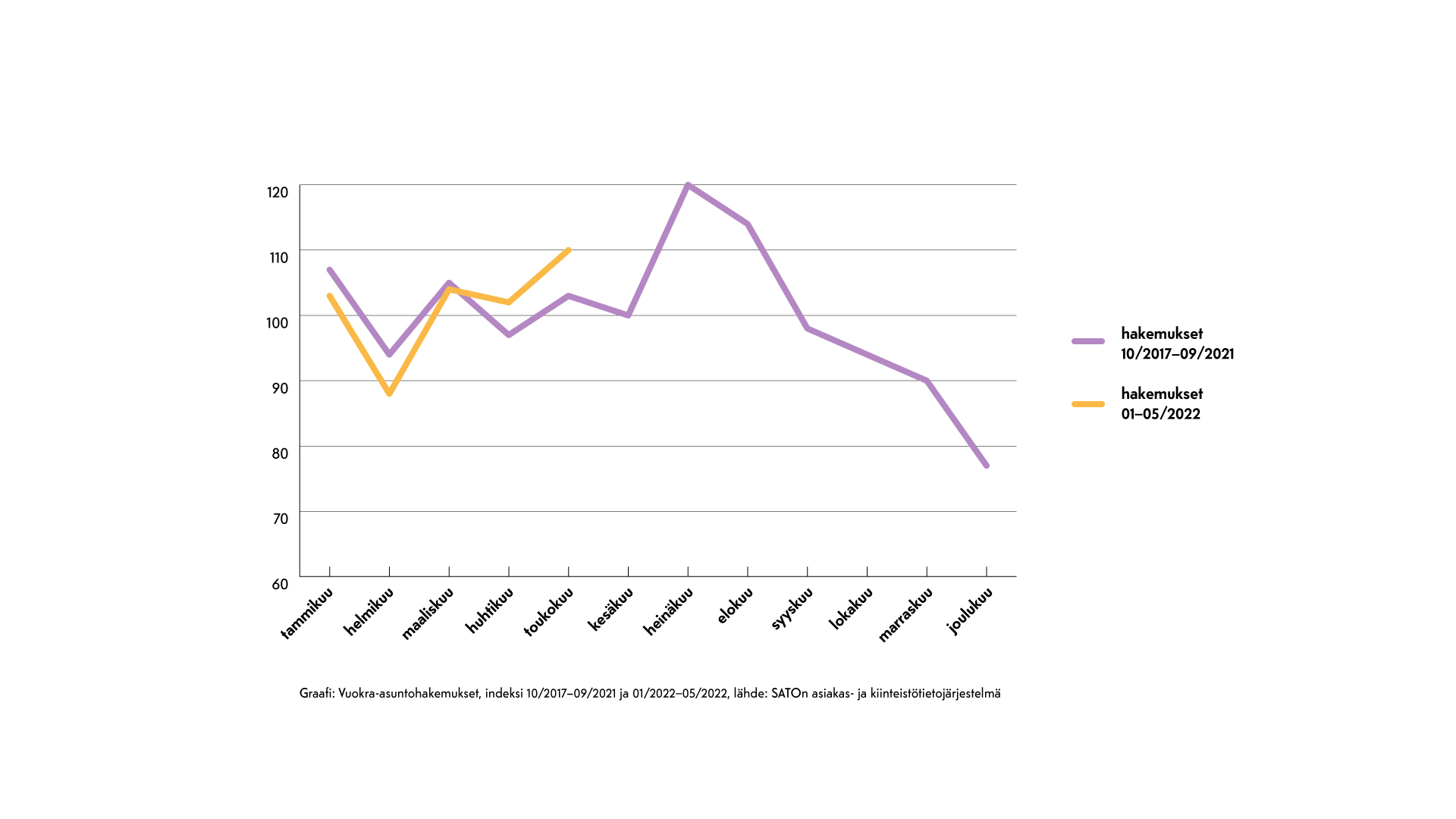 * Graafi: Vuokra-asuntohakemukset, indeksi 10/2017−09/2021 ja 01/2022-05/2022, lähde: SATOn asiakas- ja kiinteistötietojärjestelmä
