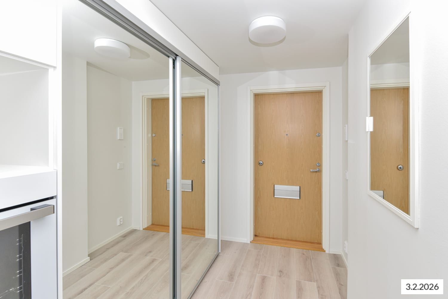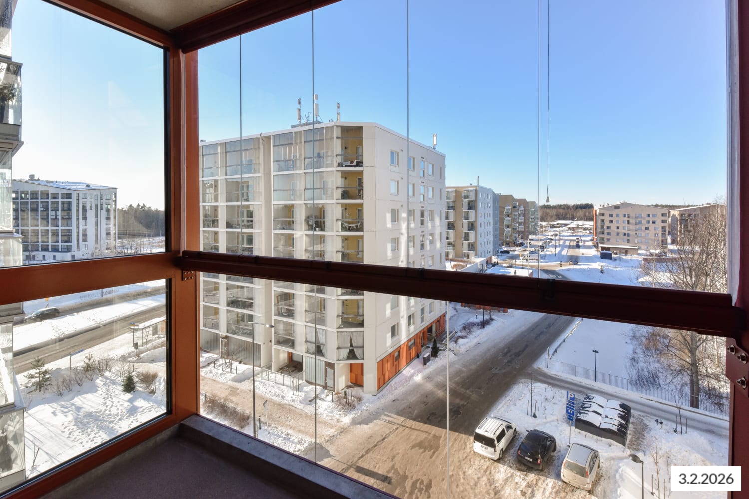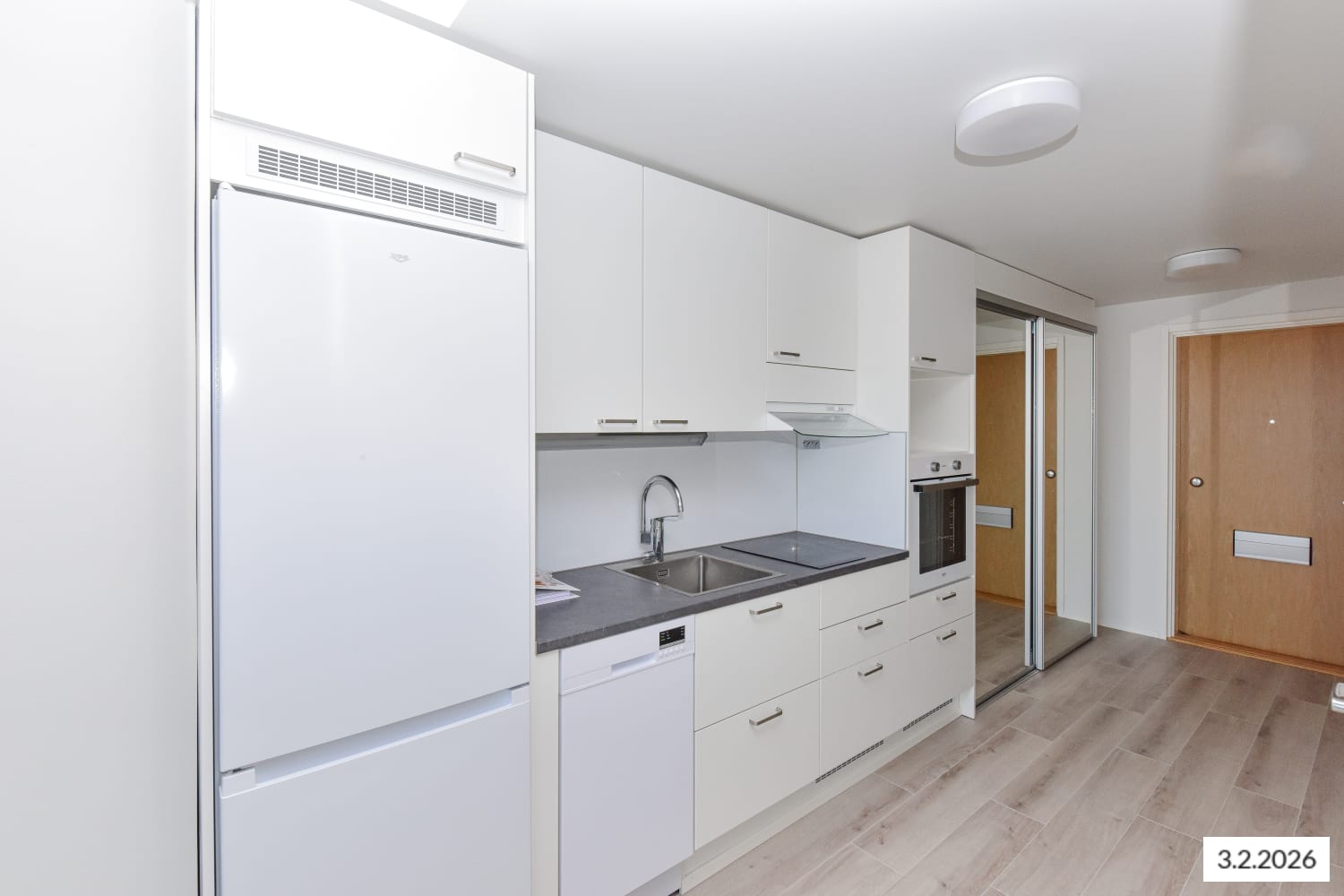 Keittiö on sopivasti hieman sivussa olohuoneesta, joten voit kalustaa huoneen monella tapaa. Kesäaikaan voit jatkaa oleskelutilaa länteen avautuvalle, lasitetulle parvekkeelle. Säilytyskomeroita on eteisessä.