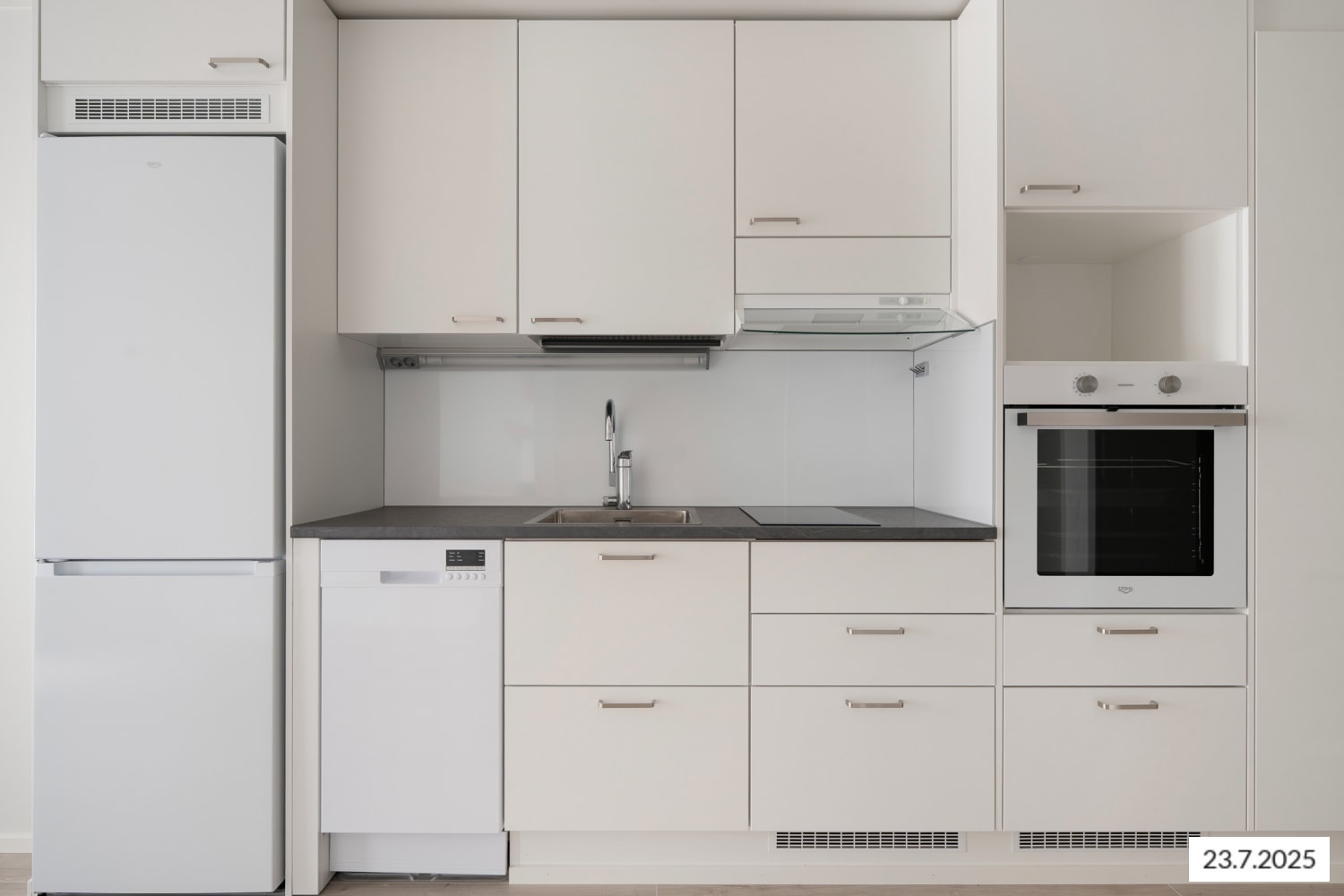 Hyvin varustellussa keittiössä on ilo kokkailla: astianpesukone hoitaa tiskit ja keraaminen liesi on helppo pitää puhtaana. Mikroaaltouunillekin on paikka valmiina.