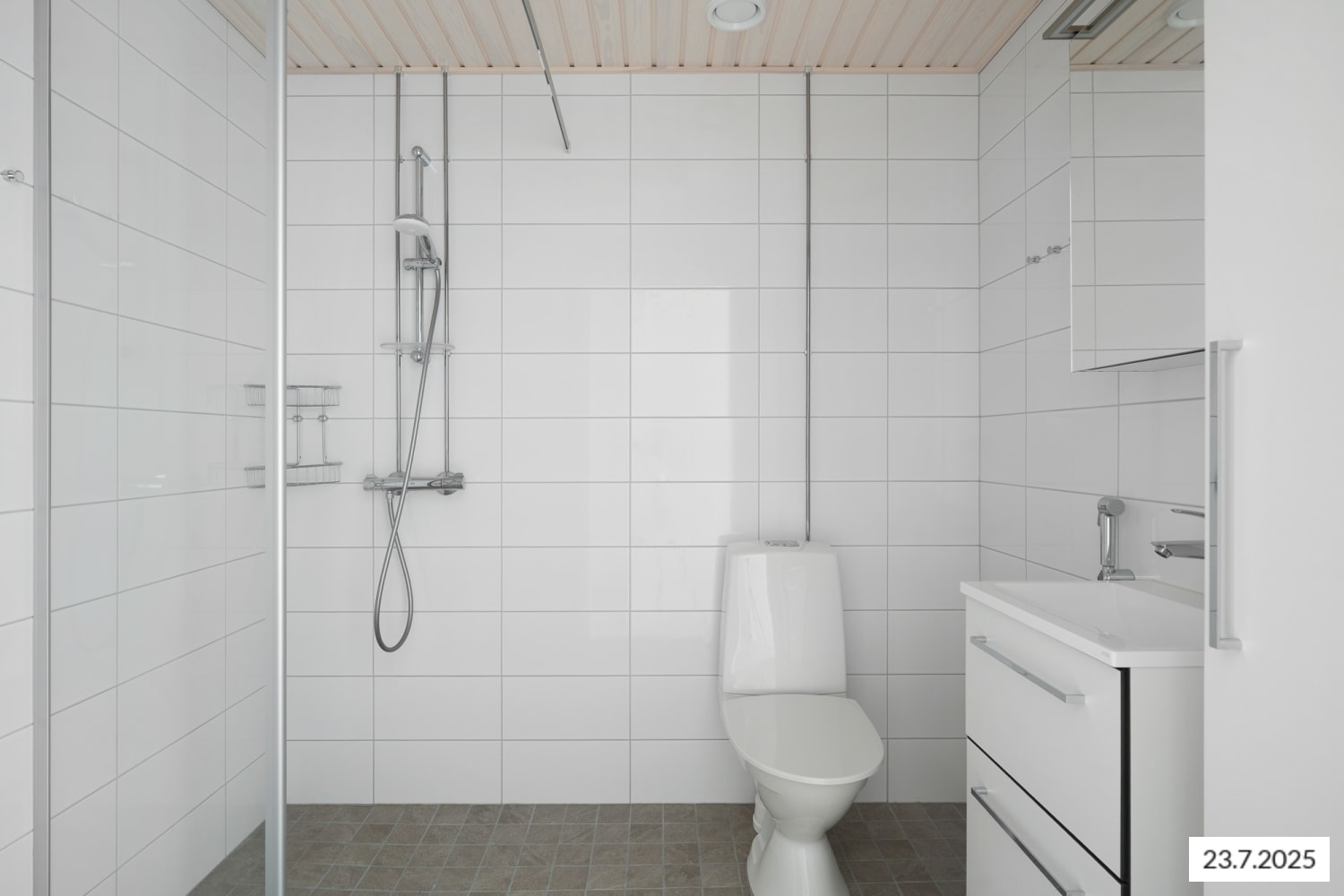 Raikkaan kylpyhuoneen seinät ovat valkoista ja lattia harmaata keraamista laattaa. Tilaa on rentoutumisen lisäksi myös vaatehuollolle. Heti oven vieressä on paikka pyykinpesukoneelle ja kuivausrummulle, kätevä pyykkikaappi taas helpottaa pyykkien lajittelua ja säilytystä.