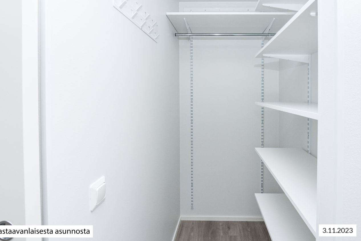 Vaatesäilytykselle on komerot sekä eteisessä että toisessa makuuhuoneessa. Isommassa makuuhuoneessa on lisäksi walk-in vaatehuone.