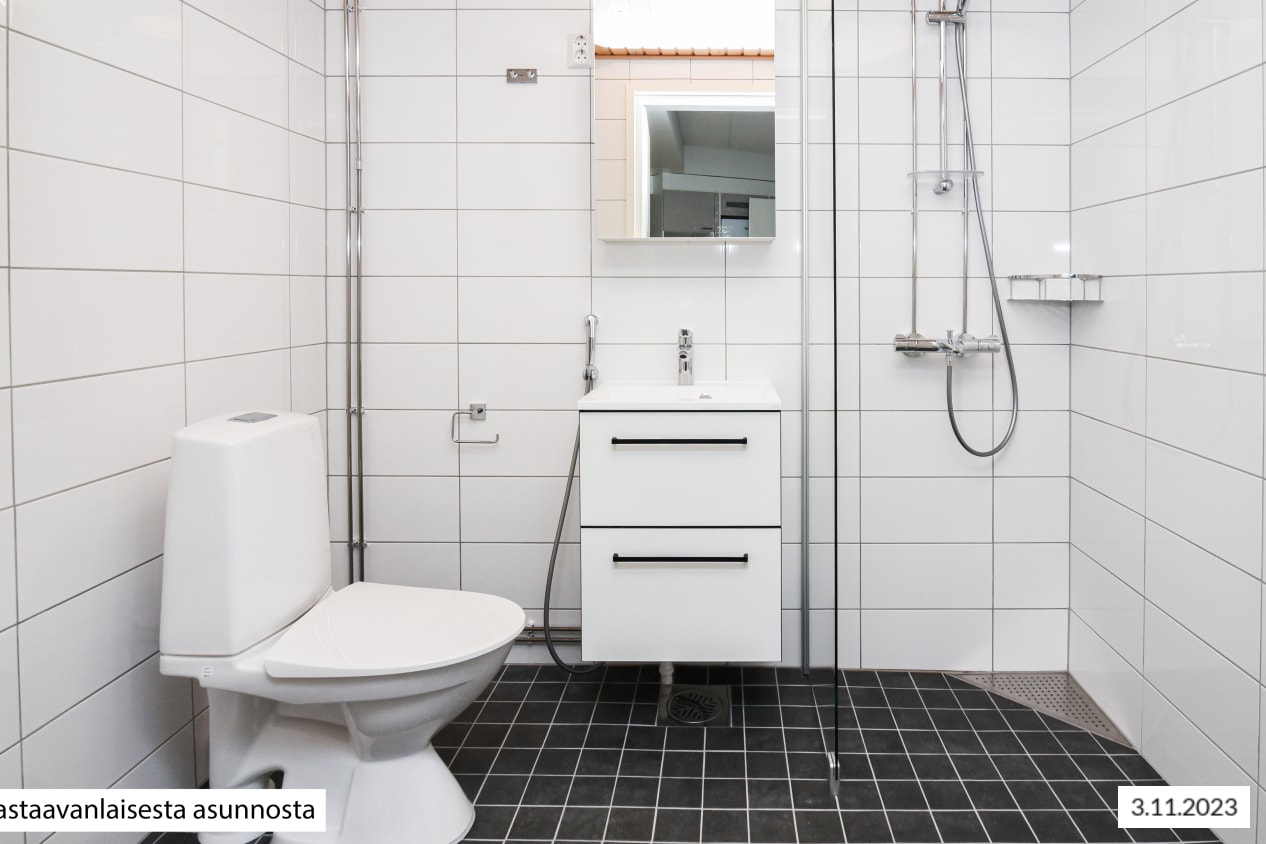 Raikkaassa kylpyhuoneessa on suihku, kätevä pyykkikaappi ja paikkavaraus pesukoneelle sekä kuivausrummulle.