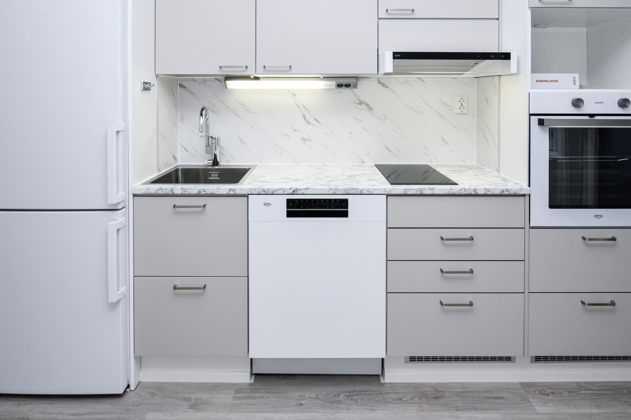 Ajattoman tyylikäs keittiö yhdistyy saumattomasti oleskelutilaan. Kattavasti varustellussa keittotilassa on ilo kokkailla: induktioliesi, liesituuletin, uuni, jääkaappipakastin ja tiskikone tekevät arjen askareista sujuvia.