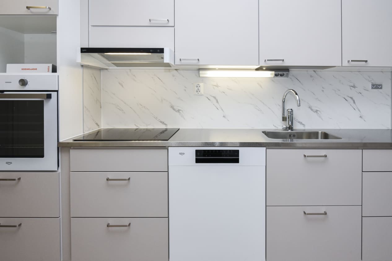 Käytännöllinen keittiö yhdistyy saumattomasti oleskelutilaan. Kattavasti varustellussa keittotilassa on ilo kokkailla: induktioliesi, liesituuletin, uuni, jääkaappipakastin ja tiskikone tekevät arjen askareista sujuvia.