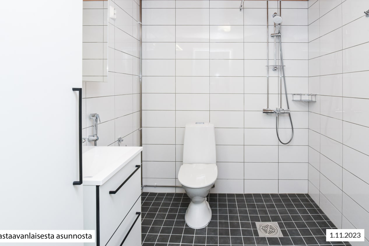 Harmoniset sävyvalinnat jatkuvat kylpyhuoneeseen, jossa on suihku, kätevä pyykkikaappi ja paikkavaraus pesukoneelle sekä kuivausrummulle.