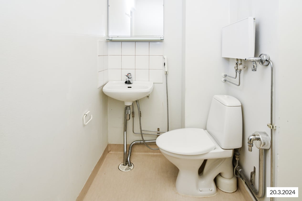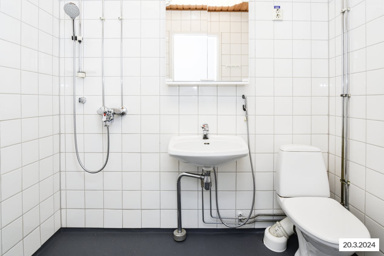 Asuinhuoneiden lattiamateriaalina on muovimatto. Kylpyhuoneessa on kosteiden tilojen muovimatto ja kaakeloidut seinät. Keittiössä on jää-pakastinkaappi ja nelilevyinen sähköliesi.