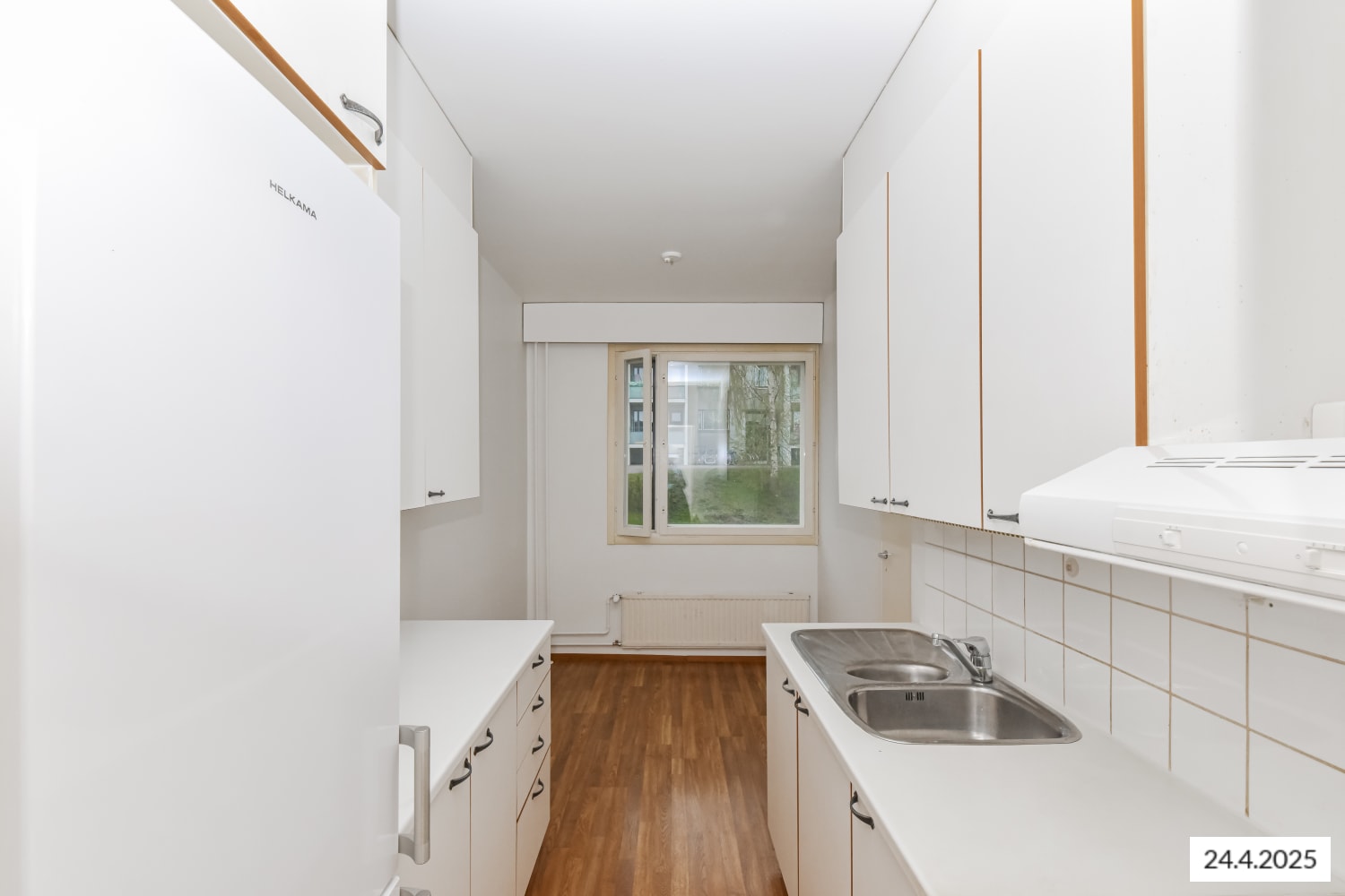 Keittiössä on jää-pakastinkaappi ja nelilevyinen sähköliesi.