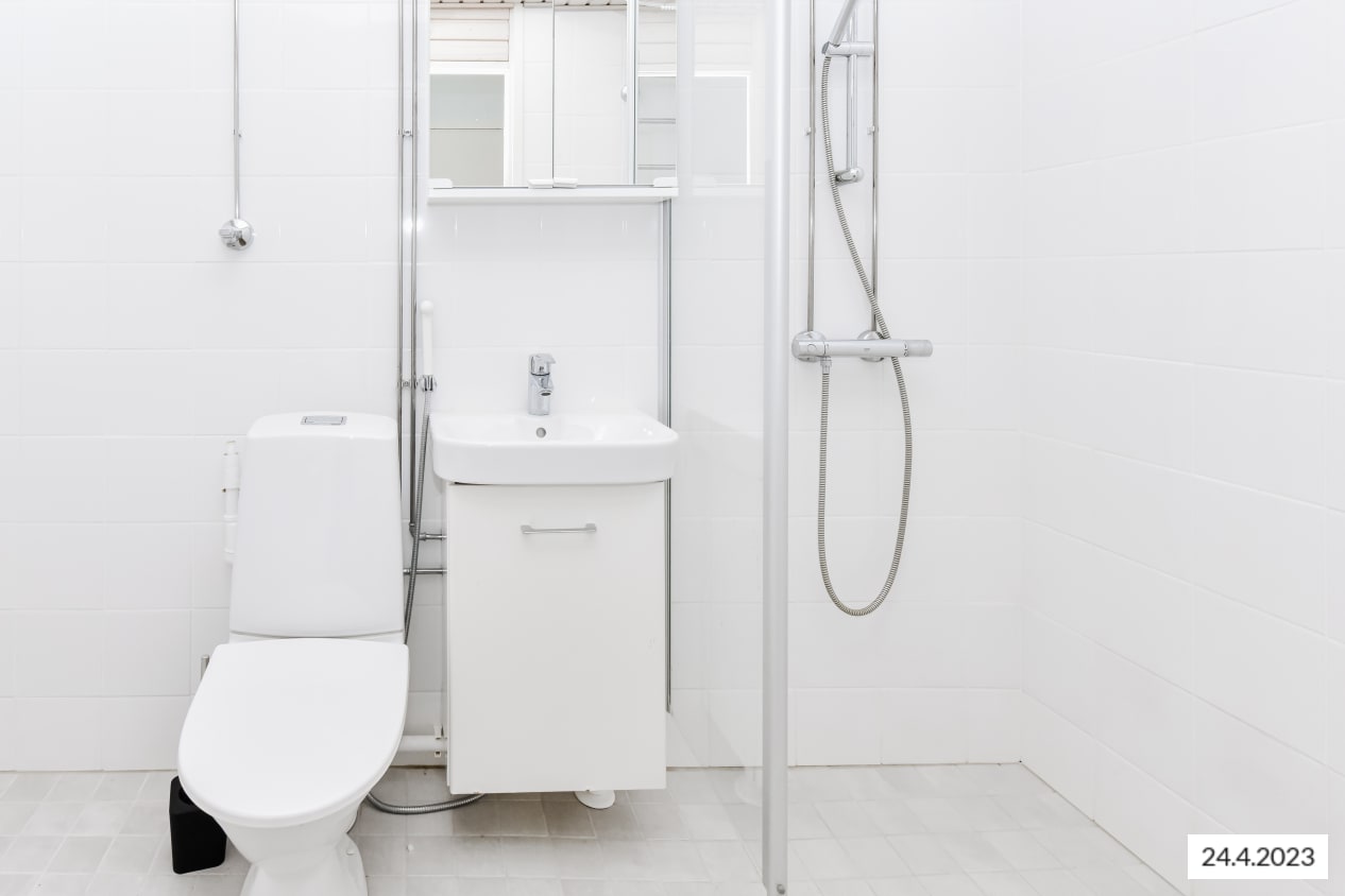 Asuinhuoneiden lattiamateriaalina on helppohoitoinen laminaatti. Kylpyhuoneessa on kaakeloidut lattia ja seinät, suihku sekä paikka pyykinpesukoneelle.