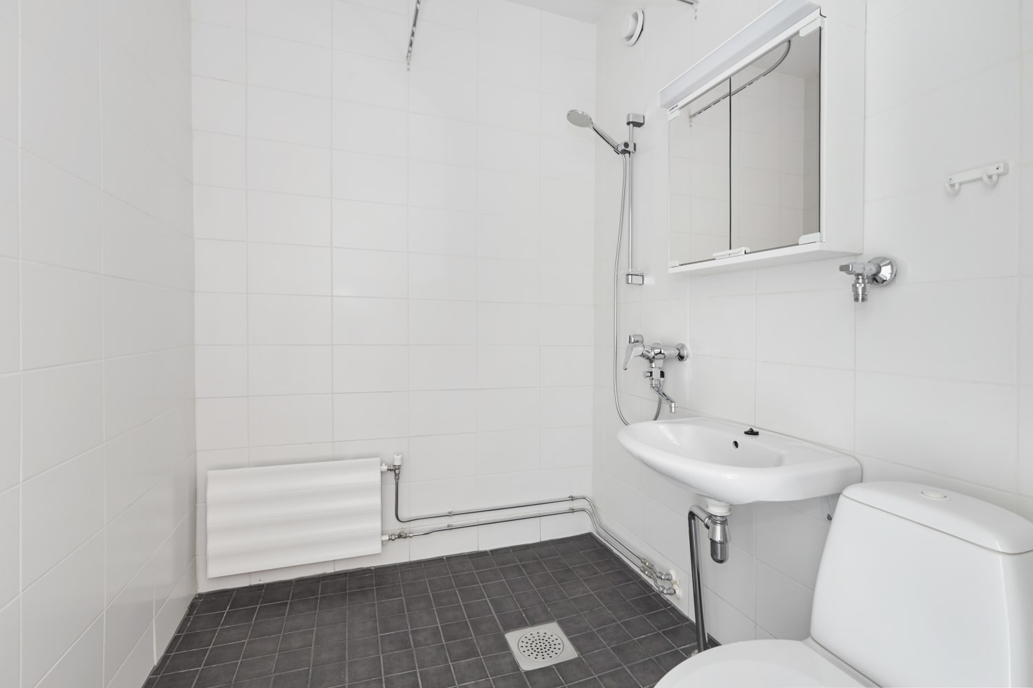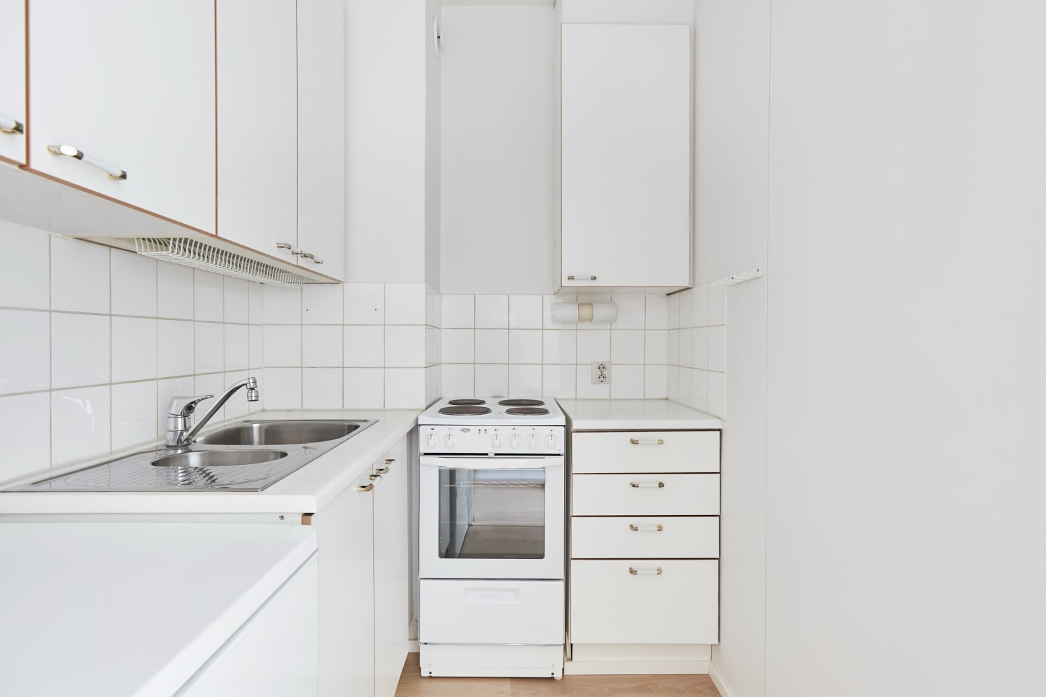 Keittiössä on lattiauuni, liesi sekä matala jääkaappi. Keittiössä on kaappitilaa reilusti. Lattiamateriaali on vaaleaa laminaattia ja seinät on maalattu vaaleiksi. Olisiko tämä sinun seuraava vuokrakotisi?